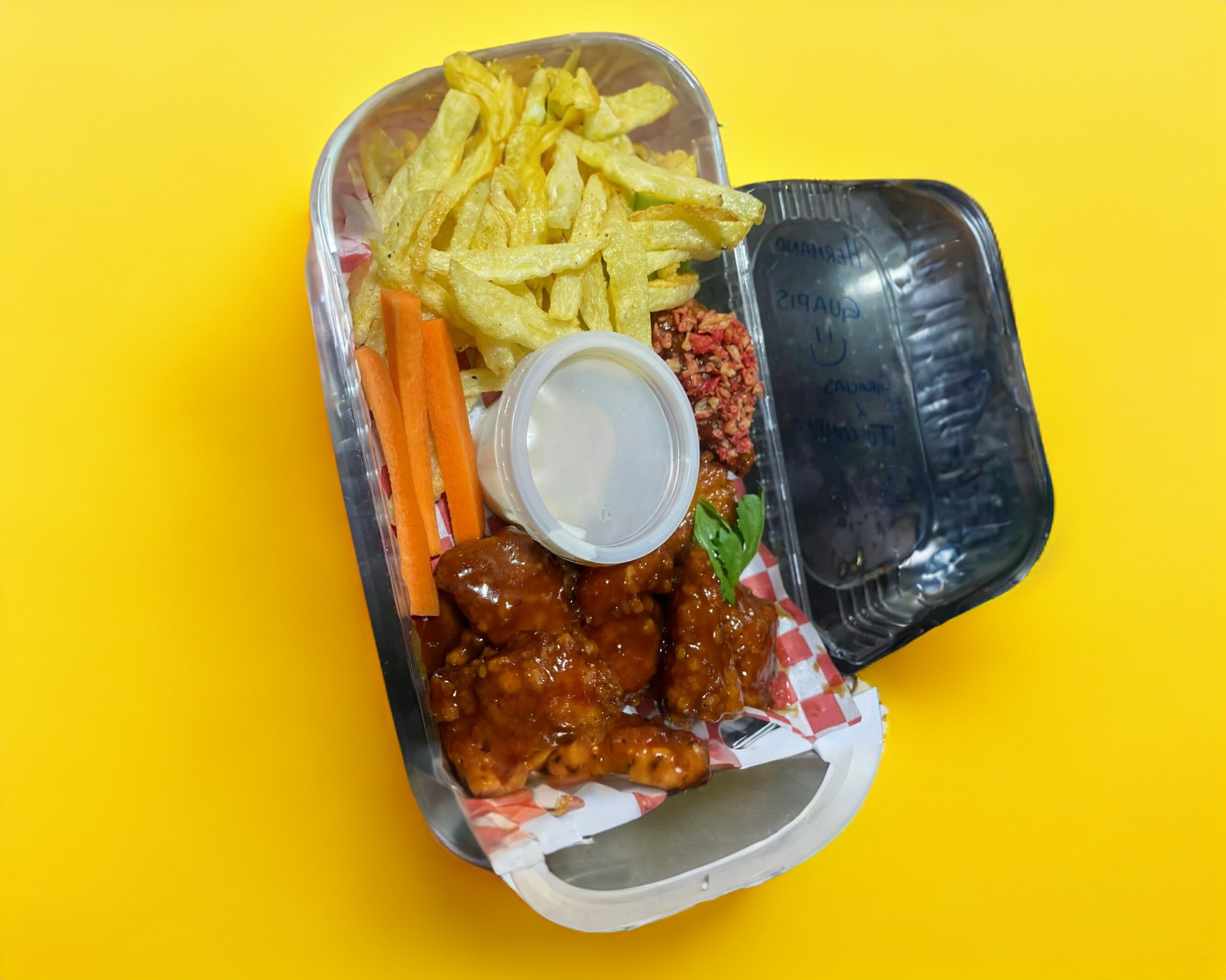 300 gr boneles bbq hot, orden de papas a la francesa, aderezo ranch,