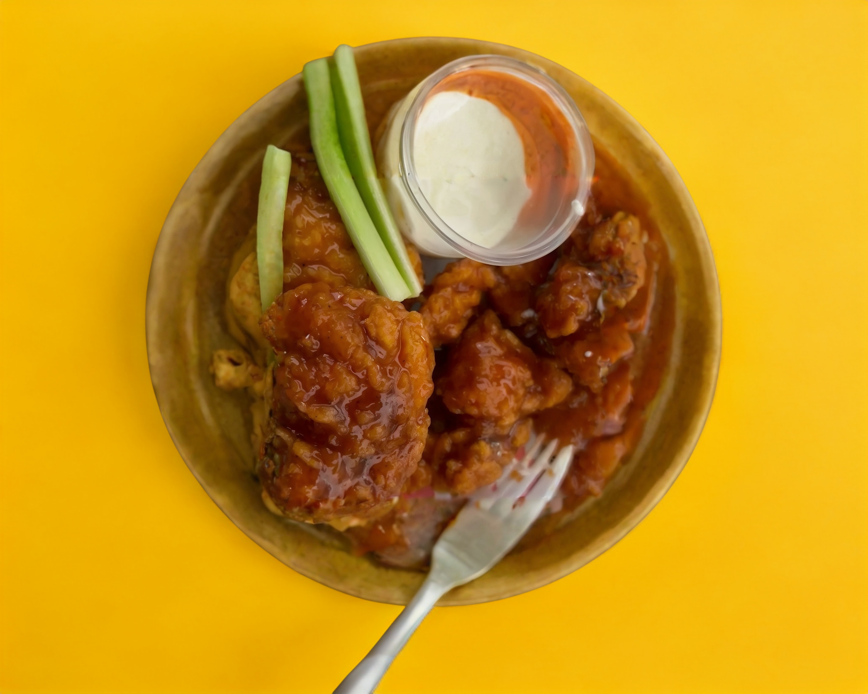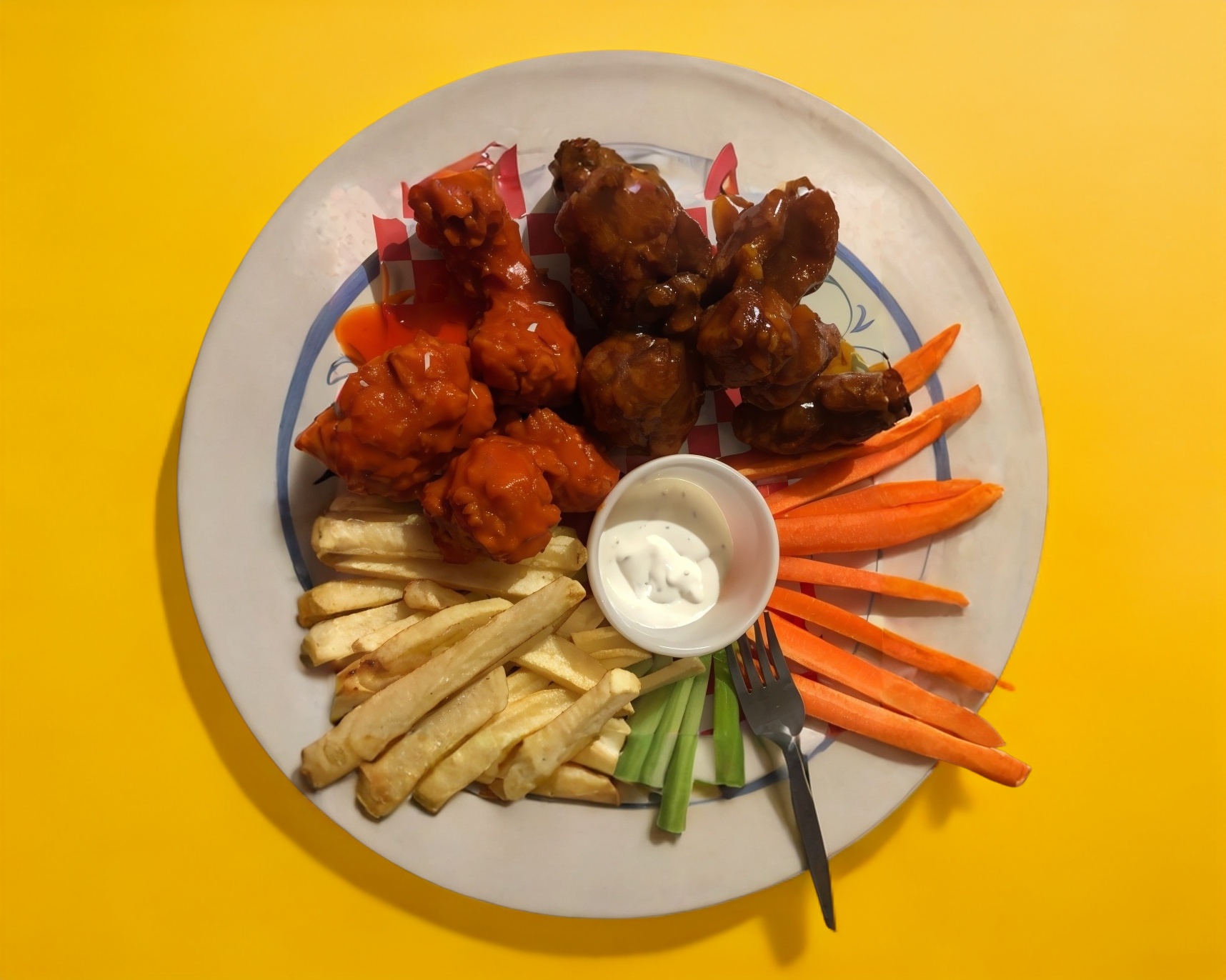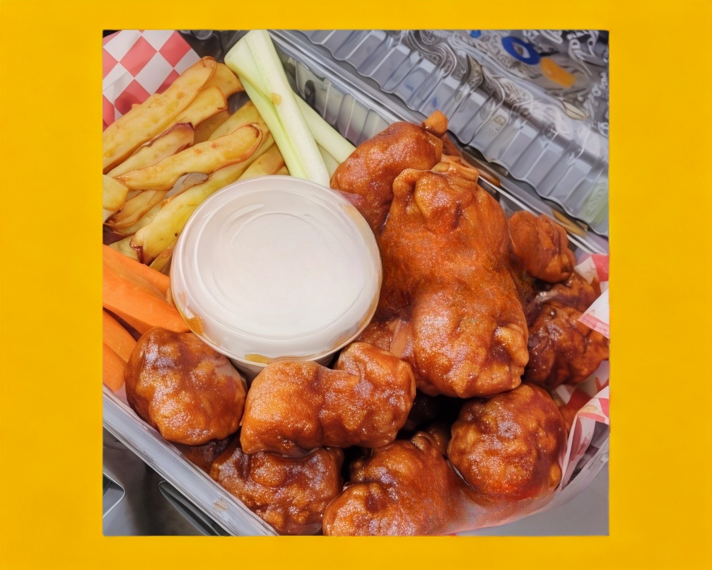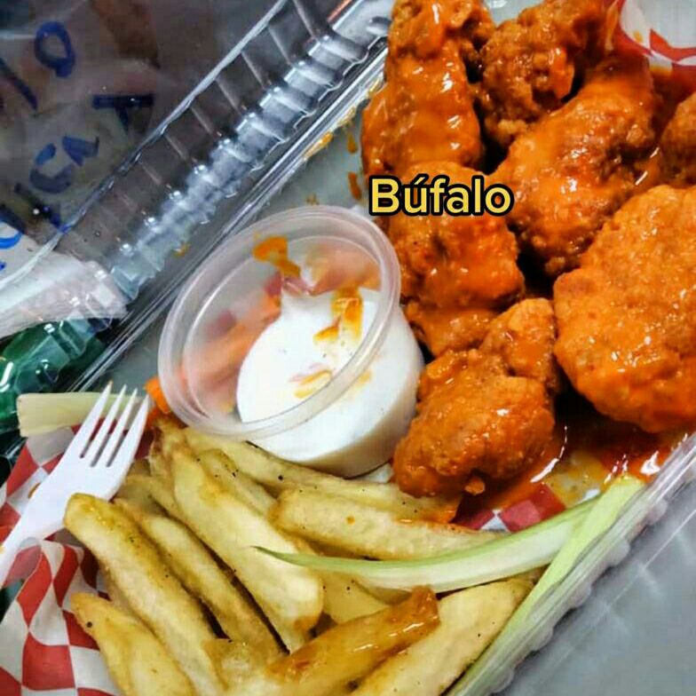 300 gr de boneless mitad bufalo, mitad mango habanero,orden de papas a la francesa, aderezo ranch,