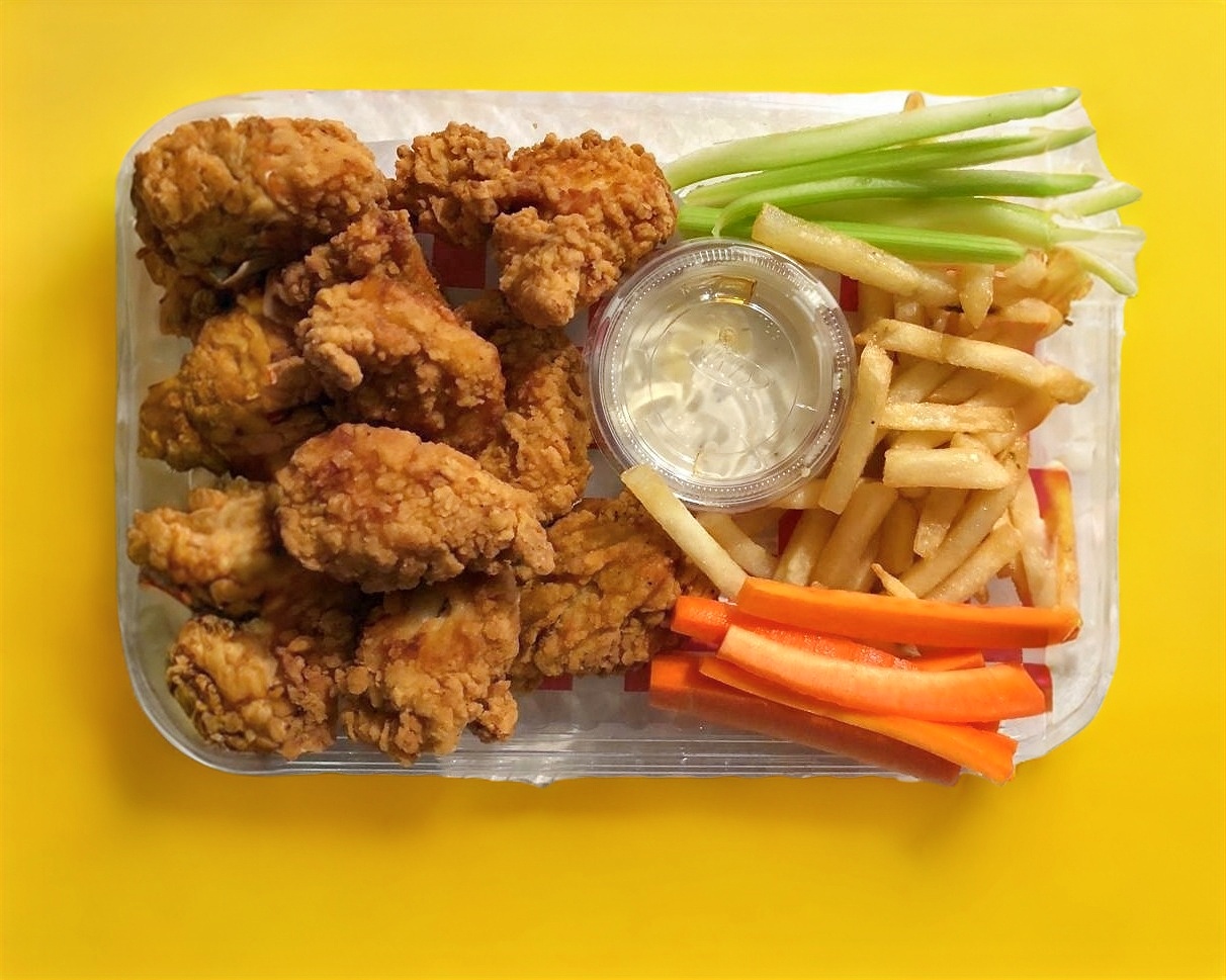 300gr boneles con salsa mango habanero, 1 orden de papas a la francesa, aderezo ranch.