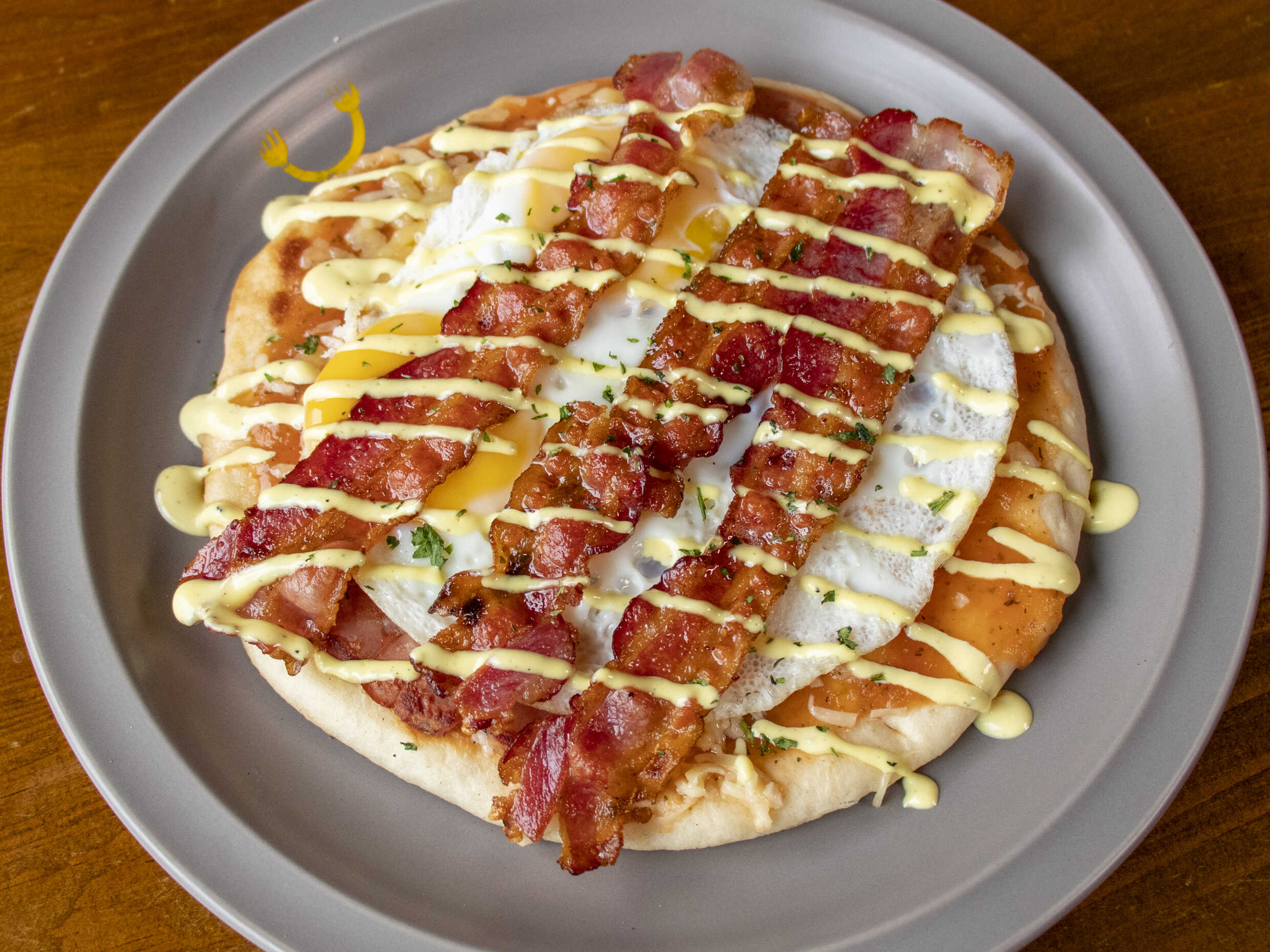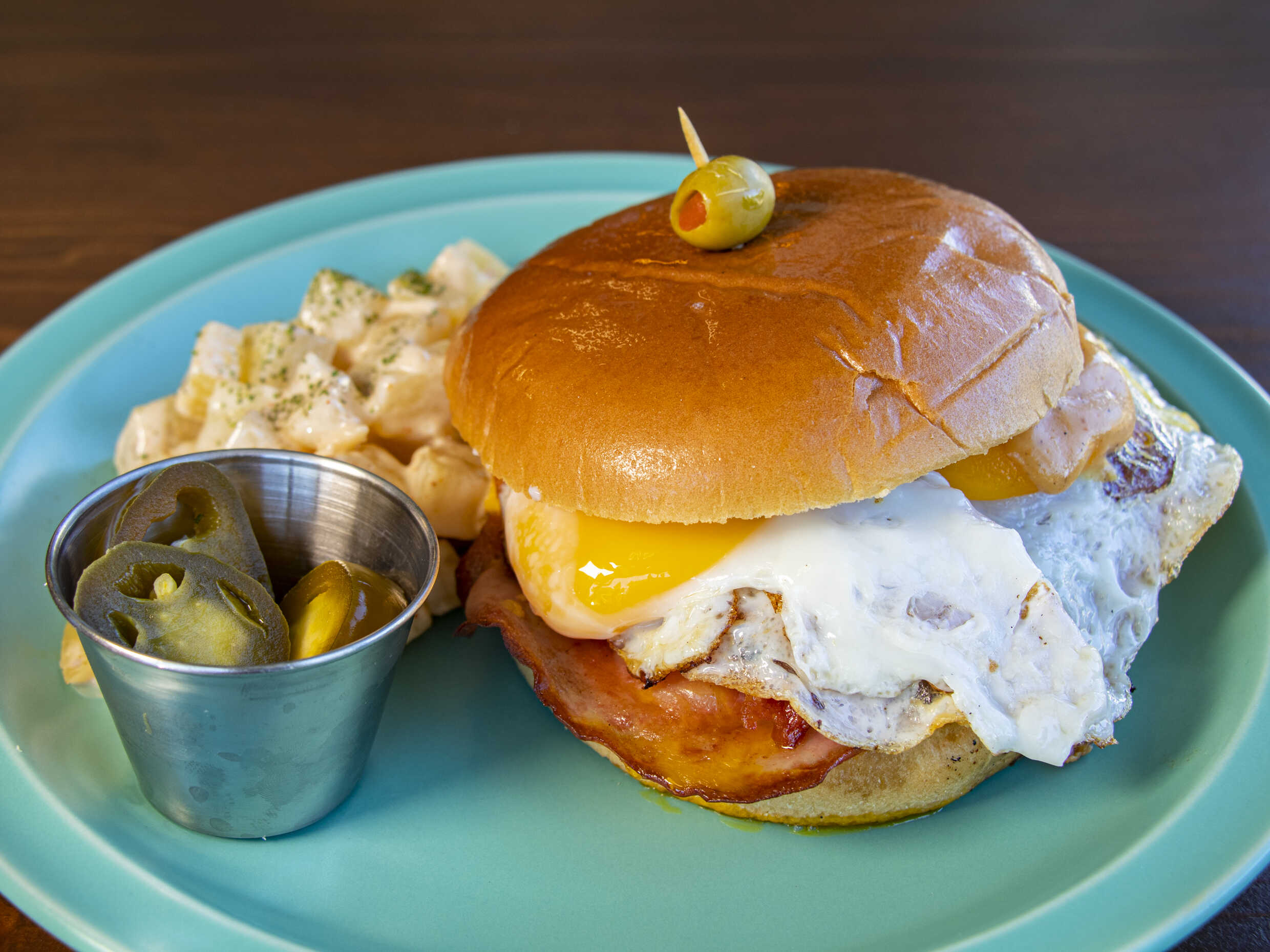 Deliciosa carne de hamburguesa con dos huevos estrellados, tocino, jamón y queso acompañado de papas crema o papas chorizo.