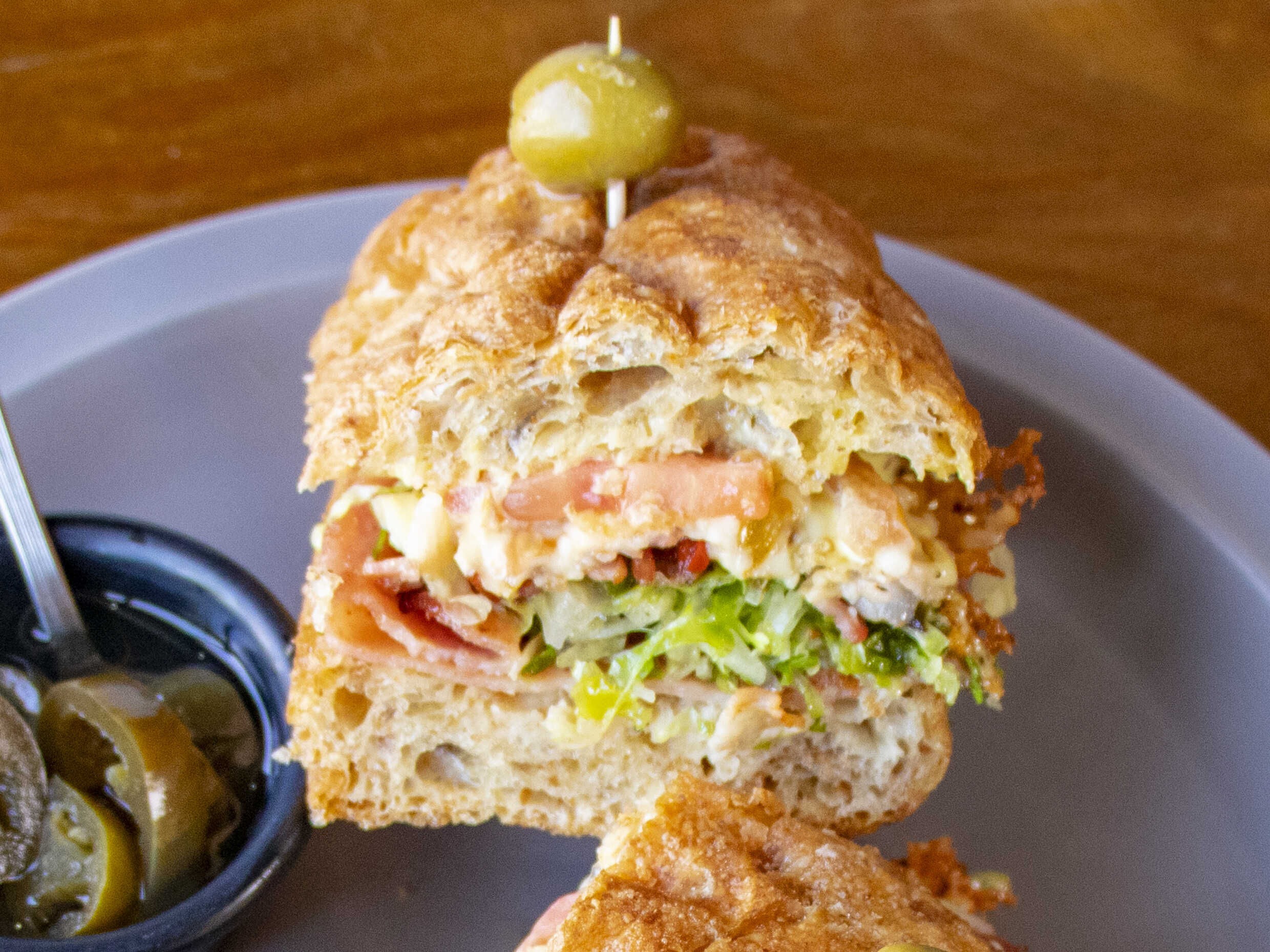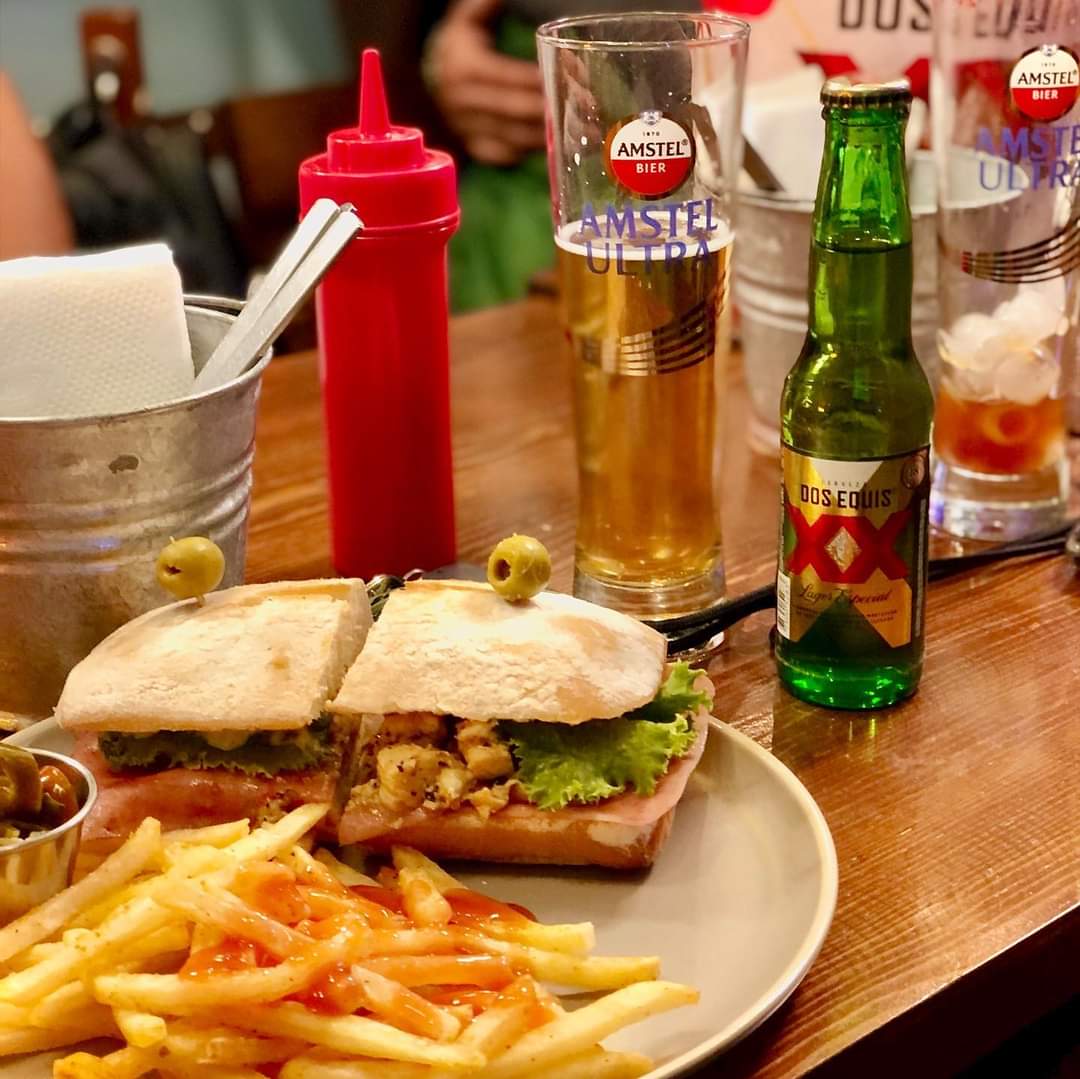 Chicken Lettuce Under Bacon (C.L.U.B), tres pisos de jugoso pollo, tocino doradito, jamon, fresca lechuga y queso blanco gratinado, acompañado de aderezo de la casa