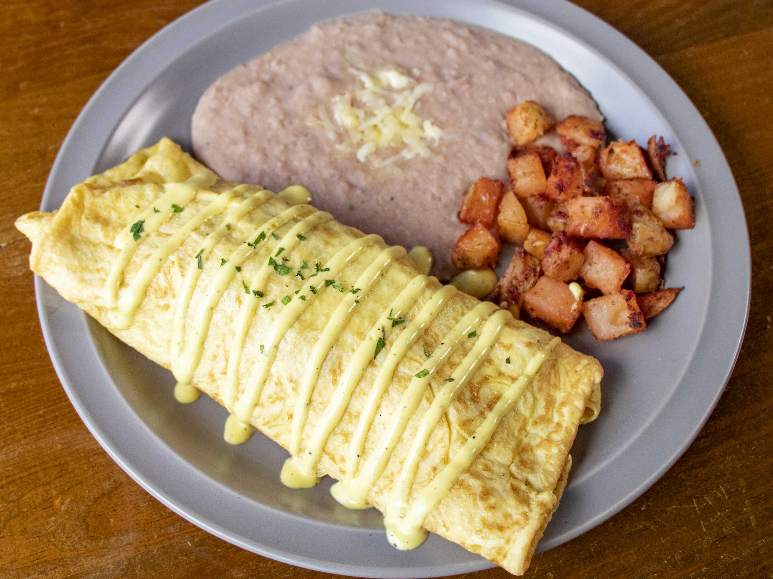 Omelette relleno de queso con 2 ingredientes, una proteina, porción de chilaquiles y papas (crema/chorizo)