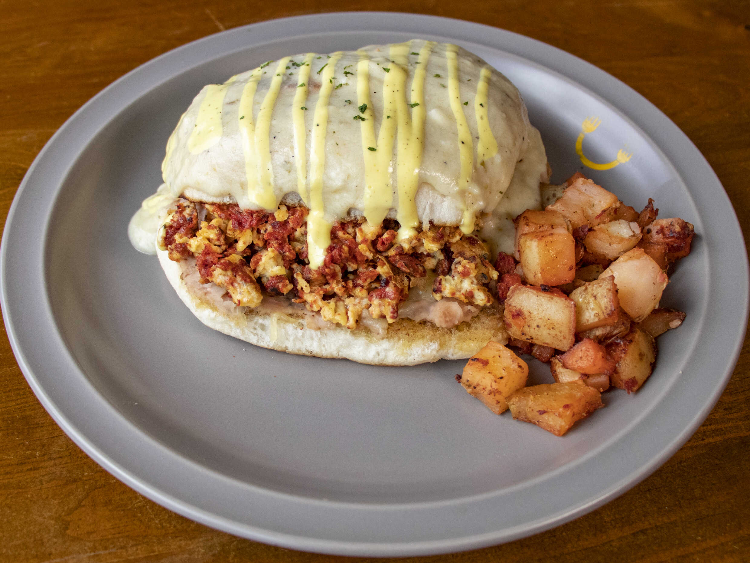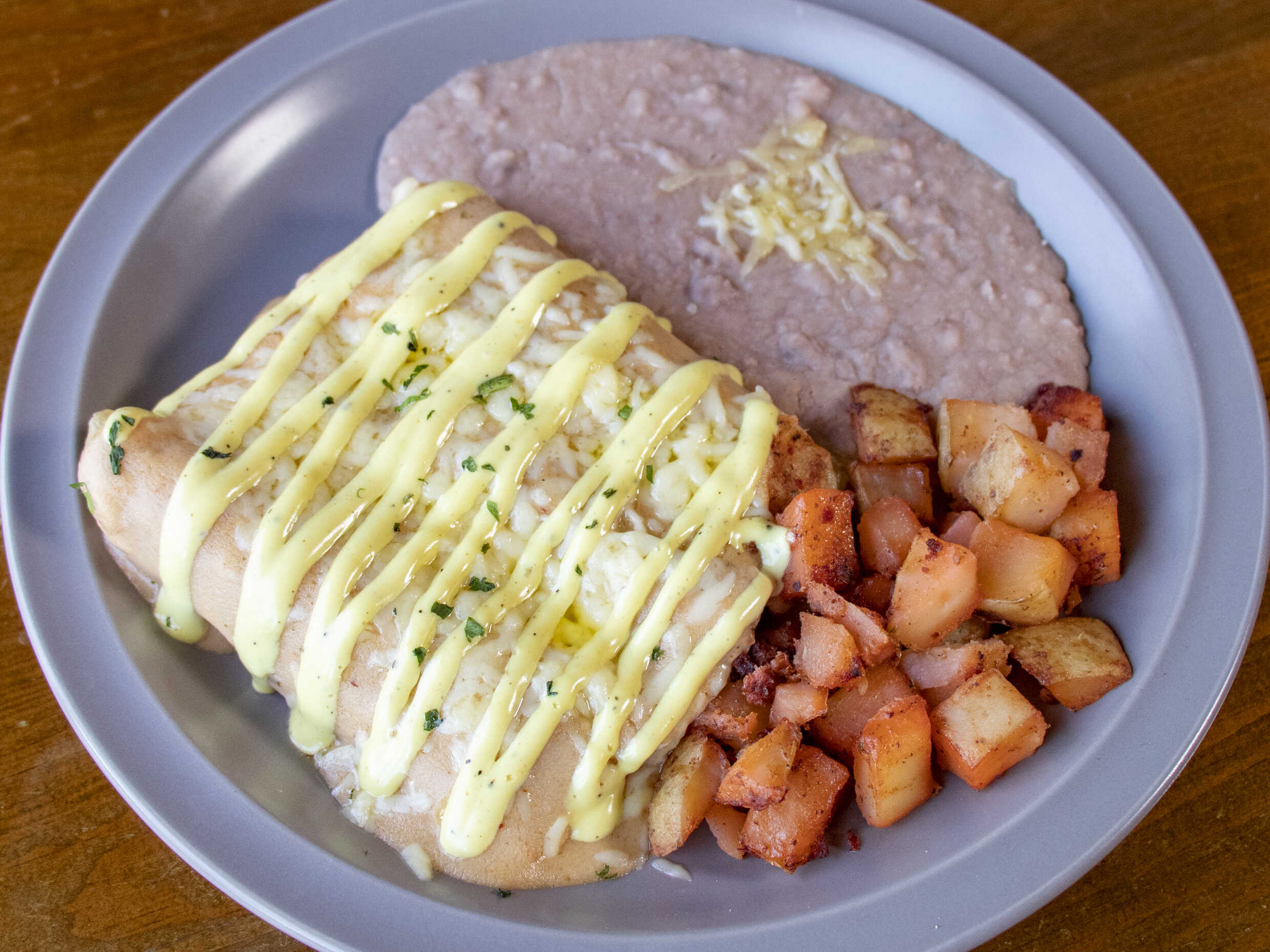Pan telera relleno de 2 (dos) huevos al gusto, frijoles refritos con queso gratinado y bañada en salsa jalapeño cremoso con aderezo de la casa acompañado de papas chorizo.