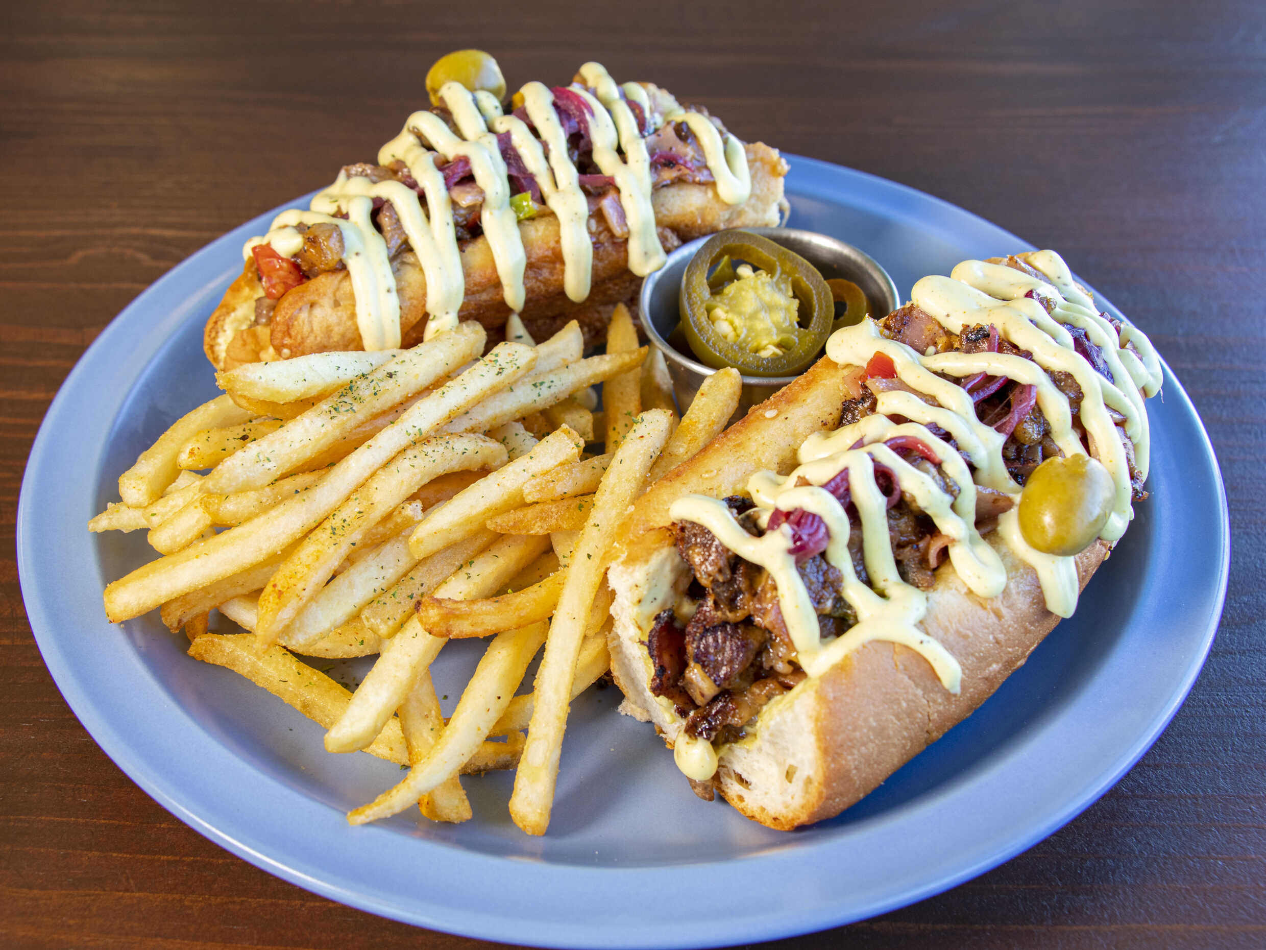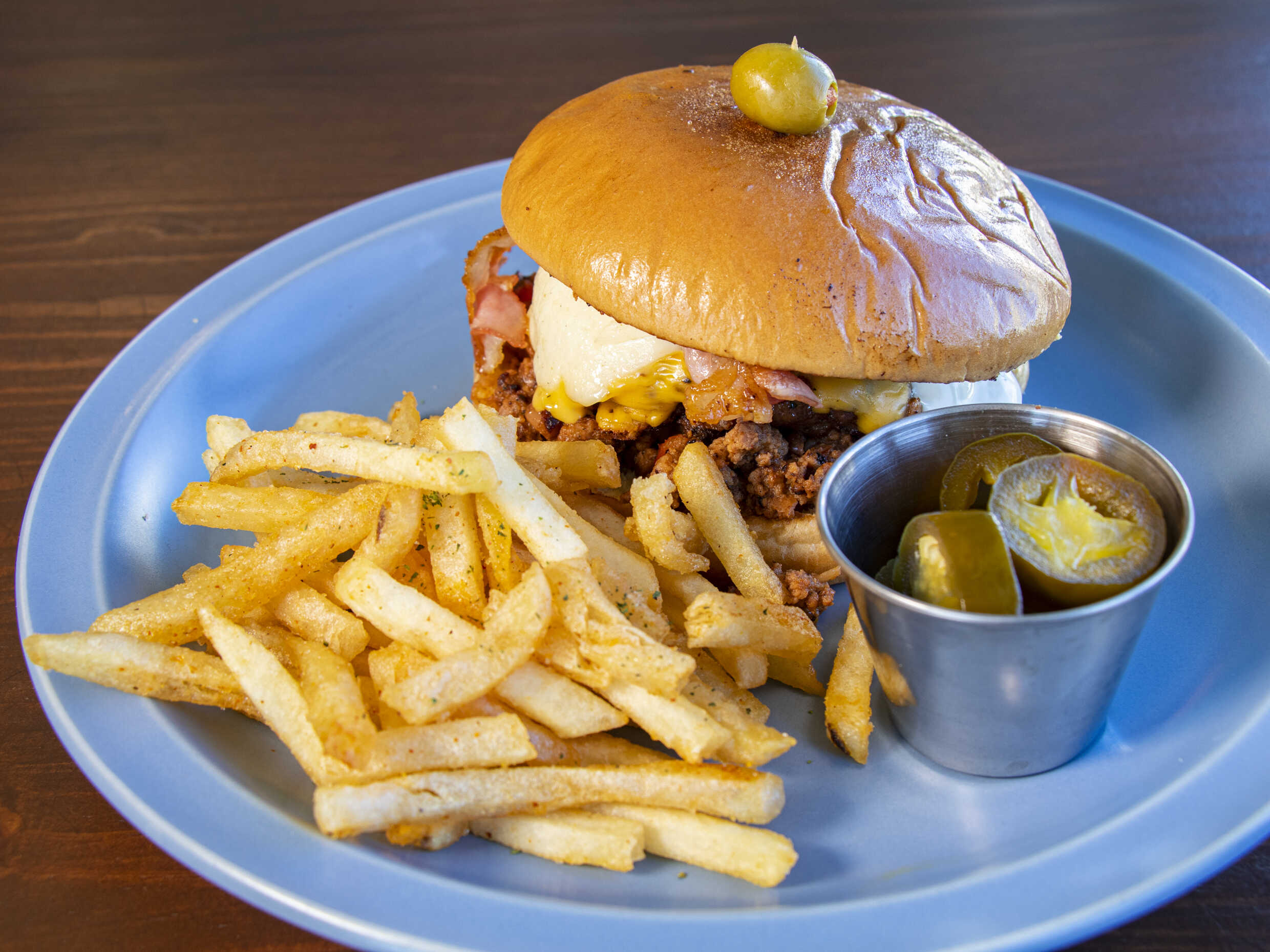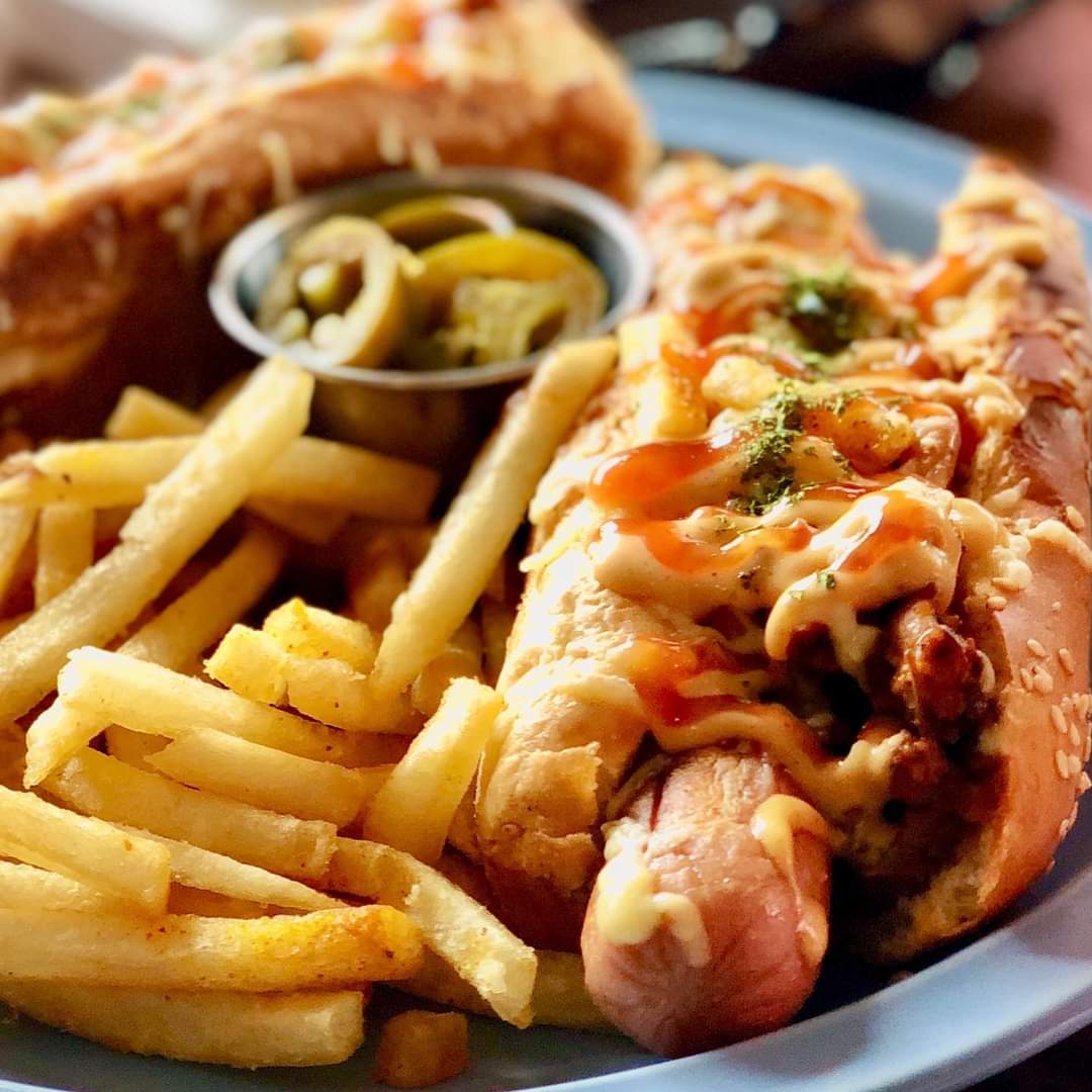 Jugosa mezcla de carnes de primera (120 g) gratinada con queso blanco y queso real amarillo americano, con exquisito chili beans y cebolla caramelizada a la jamaica