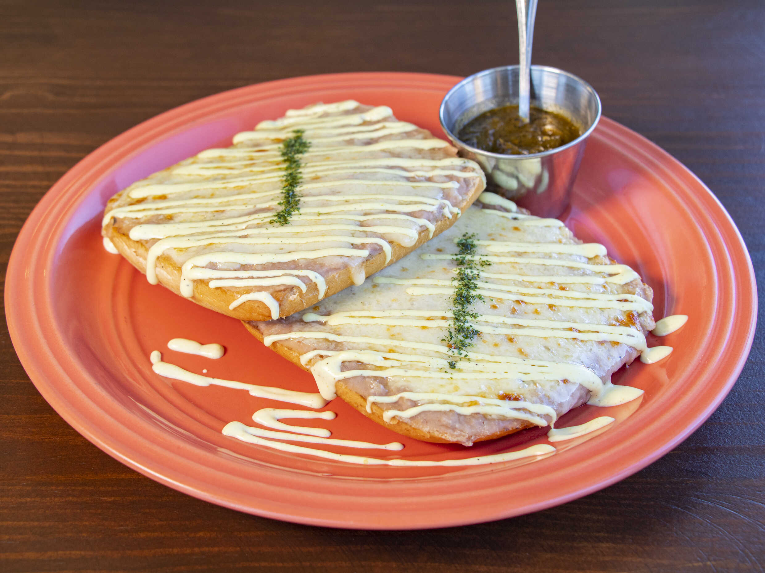 Delicioso pan telera untado de mantequilla y frijoles refritos con porción del ingrediente de tu elección, cubierto con queso gratinado.