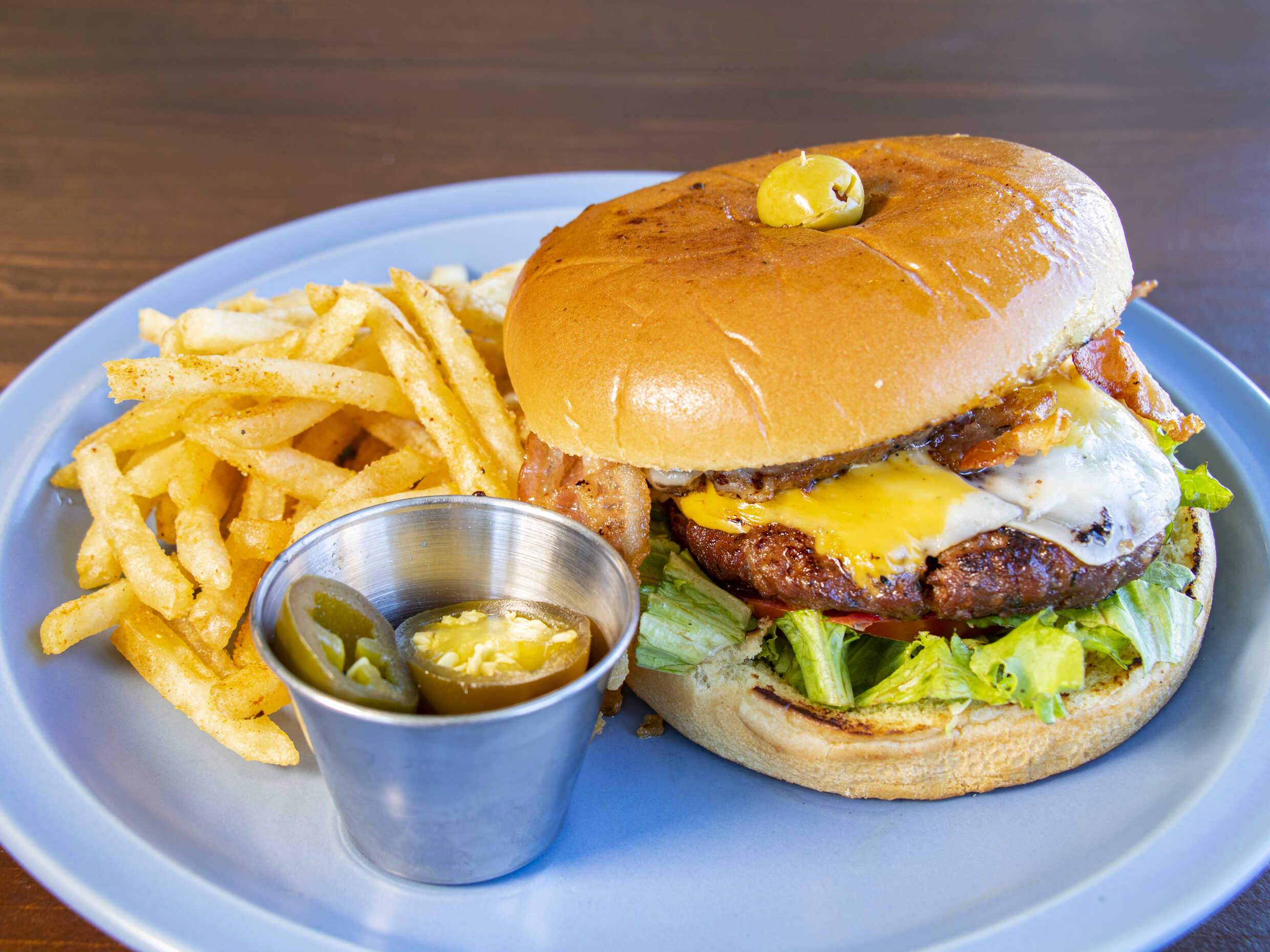 Jugosa mezcla de carnes prime (2), crujiente tocino, queso blanco regional, queso real amarillo americano, tomate, lechuga, cebolla caramelizada a la jamaica, aderezo Tita´s y papas a la francesa