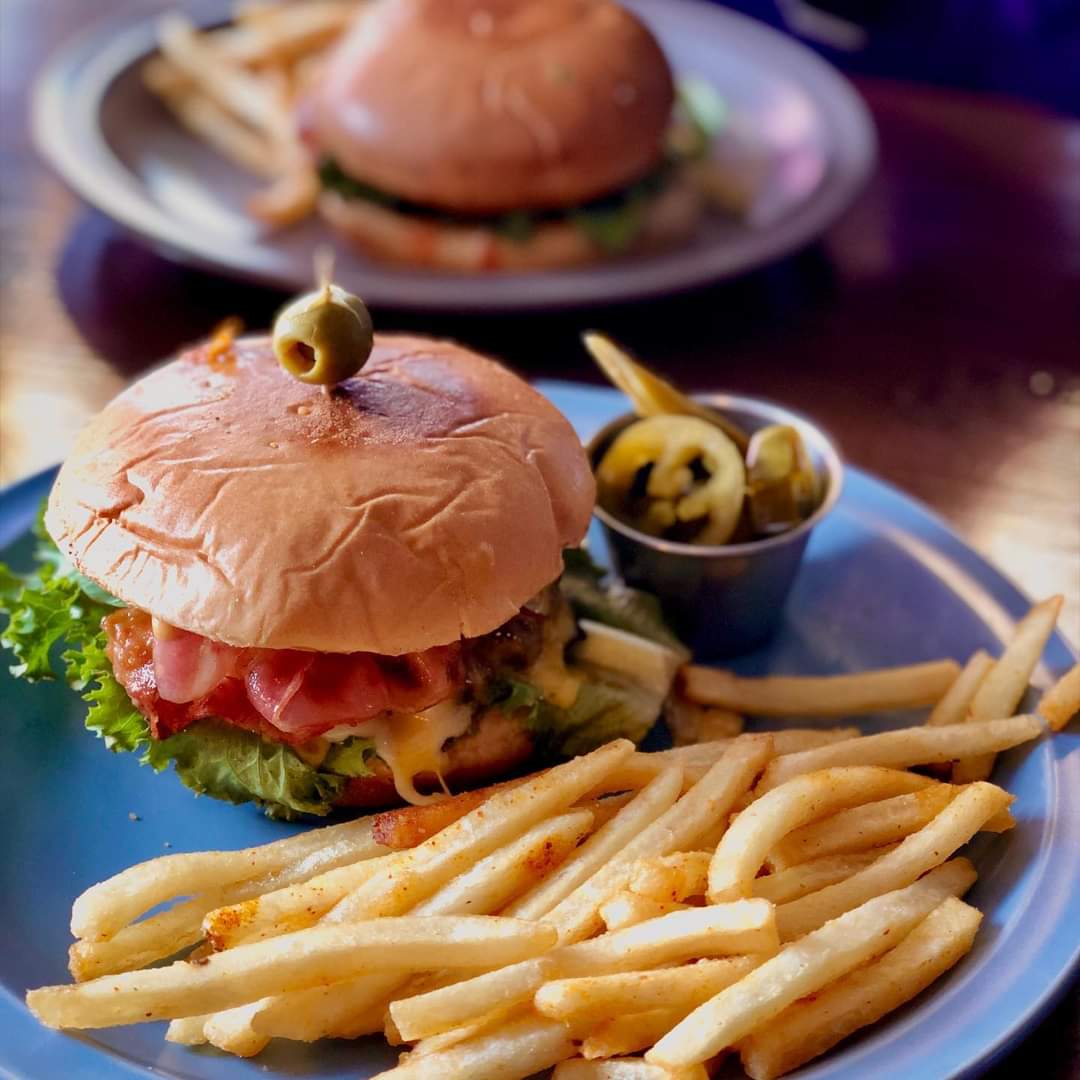 Deliciosa hamburguesa con carne de res, aros de cebolla, tocino, queso blanco y queso amarillo, aderezo chipotle y ranch, acompañada de papas a la francesa
