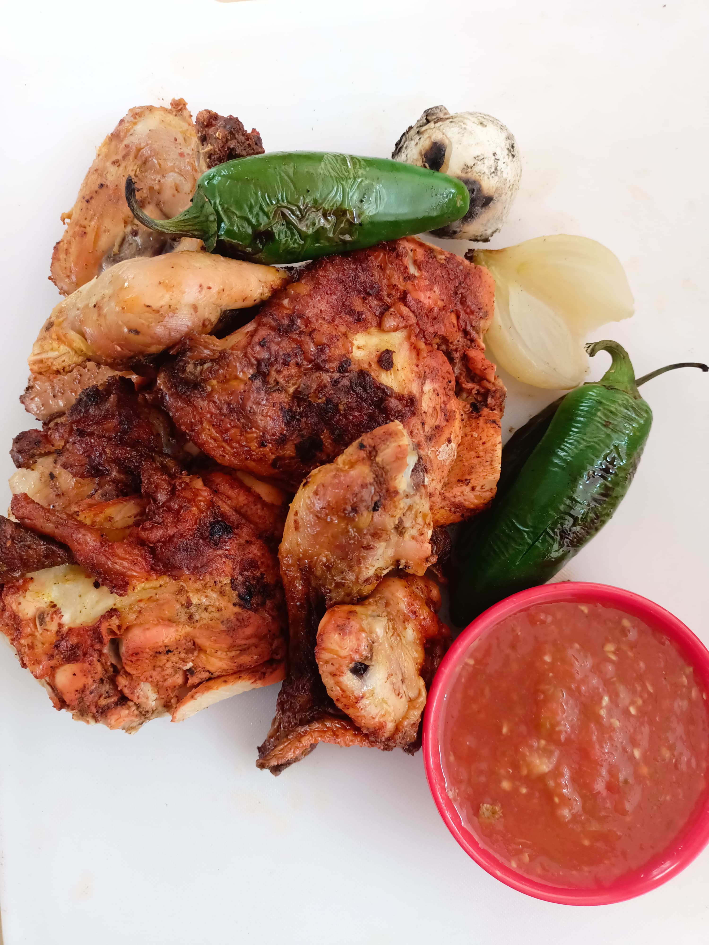 4 pzas De pollo asado, 4 tortillas, 1 chile toreado y salsa.