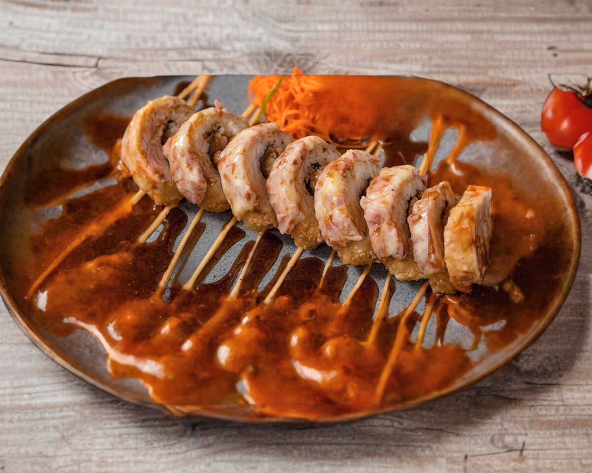 Rollo de tocino, chile serrano, por fuera pollo empanizado, bañado en salsa BBQ y salsa de anguila.