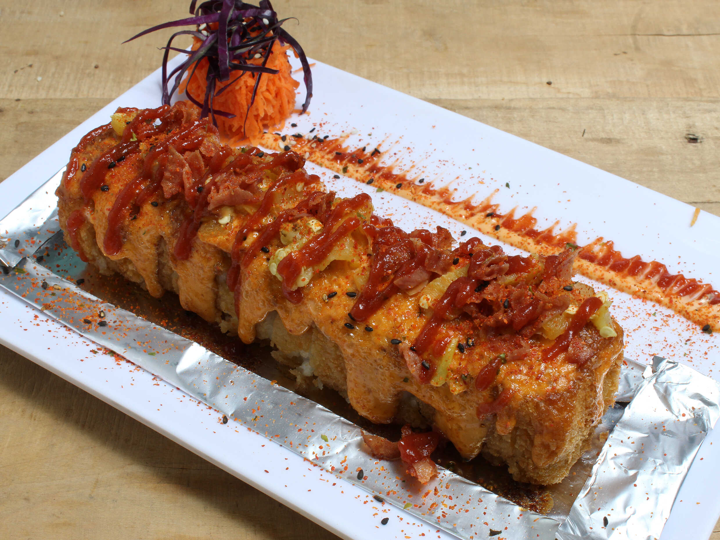 Rollo relleno de 4 dedos de queso, 4 dedos de surimi, carne, tocino y pollo, gratinado con tampico spicy, pesa 1.5 kg.