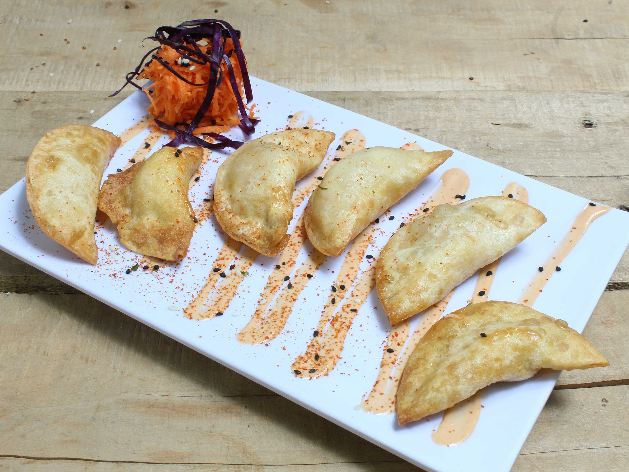 6 Piezas de dumplings rellenas de carne de cerdo sazonada oriental con una salsa matcha especial.