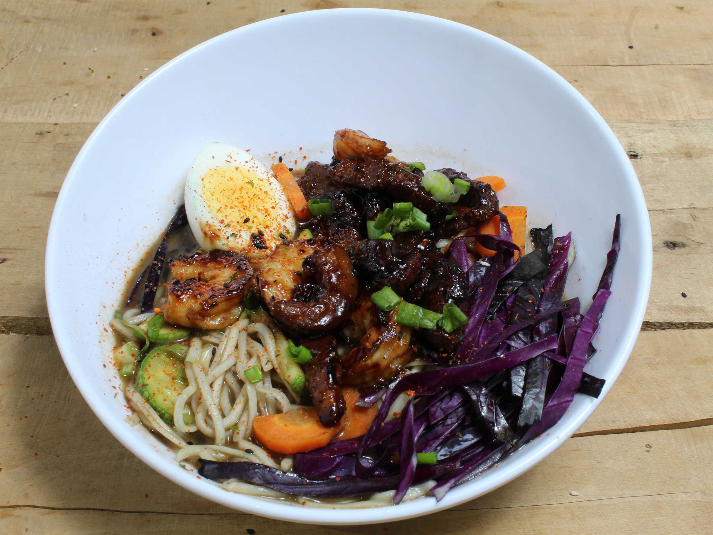 Pasta, vegetales, pollo a la plancha, salsas orientales, un rico fondo de res y cerdo.