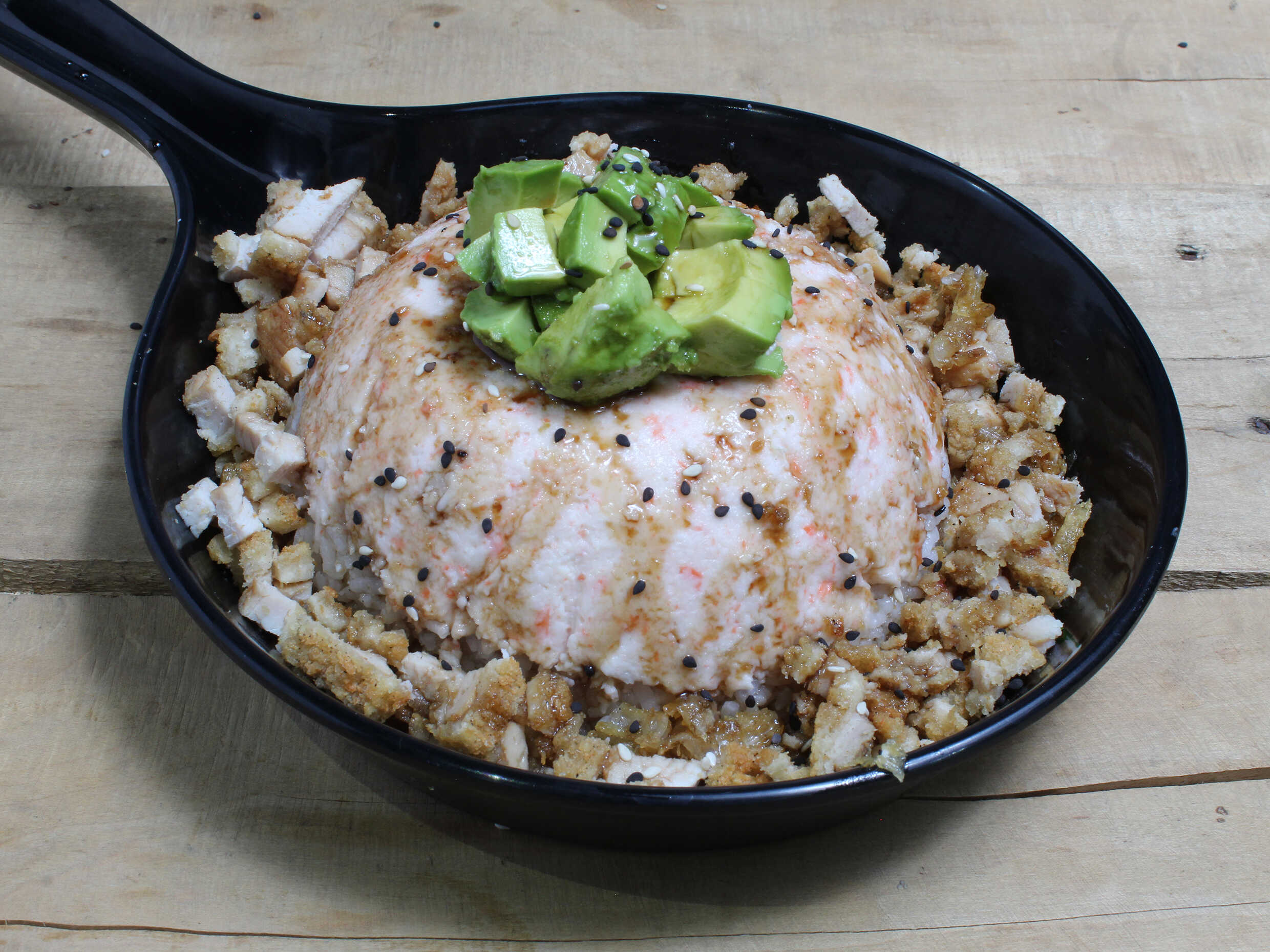 Arroz blanco, base de Philadelphia y tampico de cubitos de aguacate, pollo y cebolla capeados, bañado en salsa de anguila y ajonjolí.