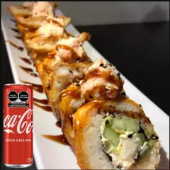Camarón y caribe por dentro, topping de tampico cheese, rodajas de aguacate, bañado en salsa de anguila y ajonjolí, rollo empanizado.