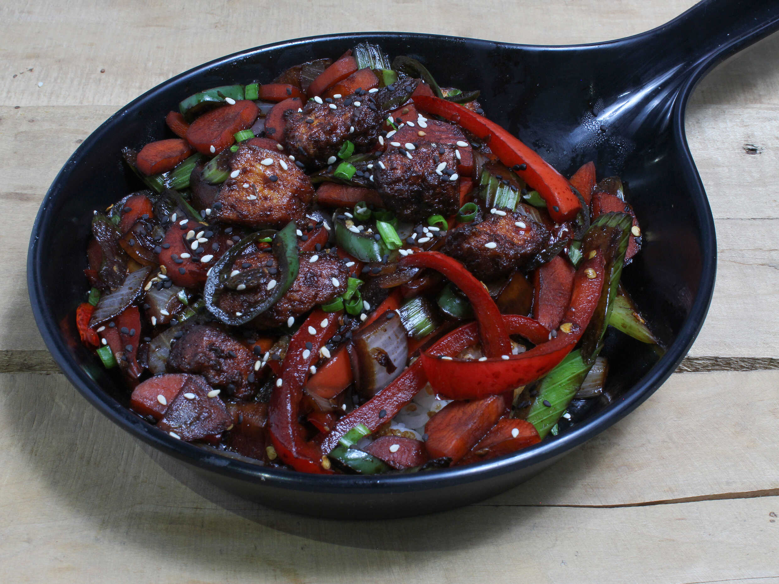 Pollo capeado, cebolla, zanahoria, apio, chile serrano, chile de árbol, salteado con salsas orientales picosito.