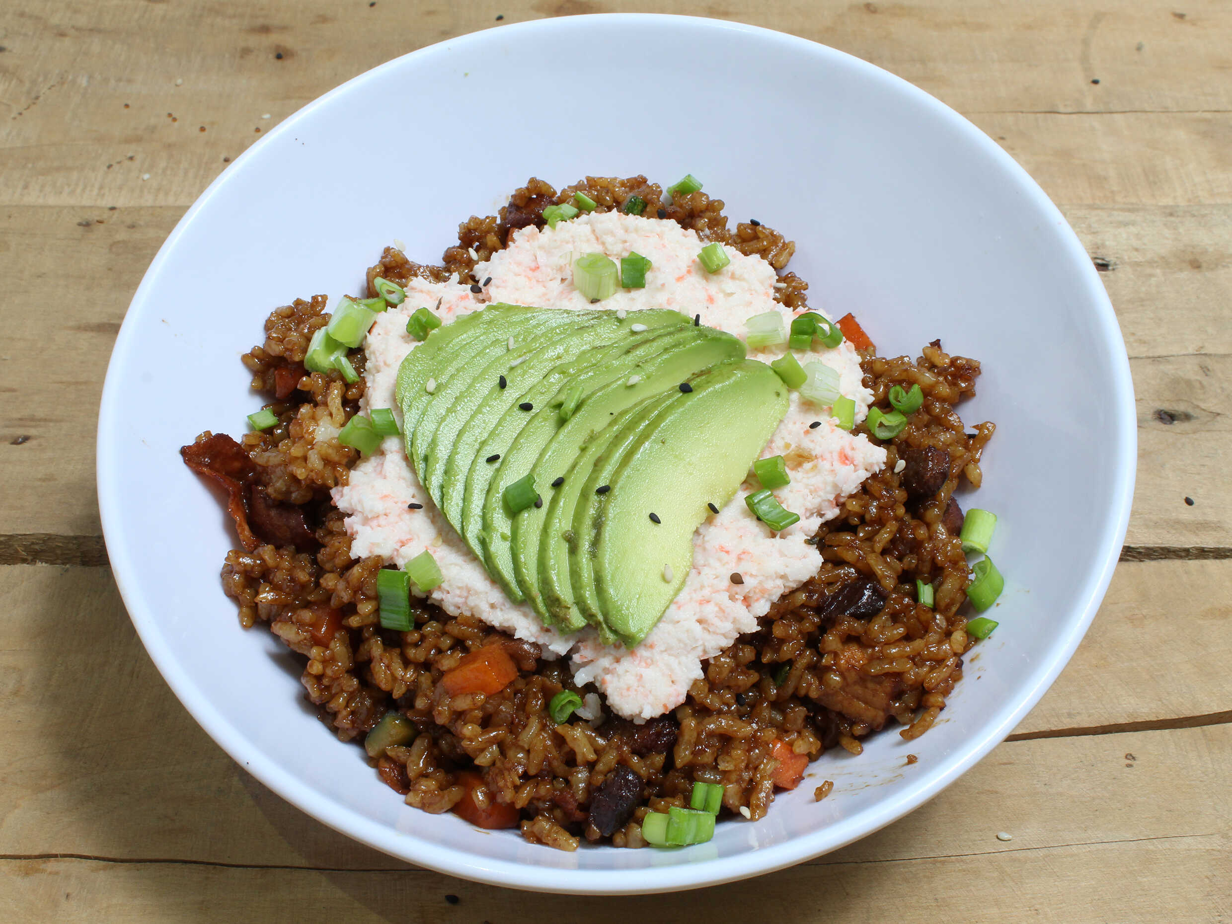Arroz frito con vegetales, carne, pollo y tocino, base de Philadelphia y tampico con rodajas de aguacate y ajonjolí.