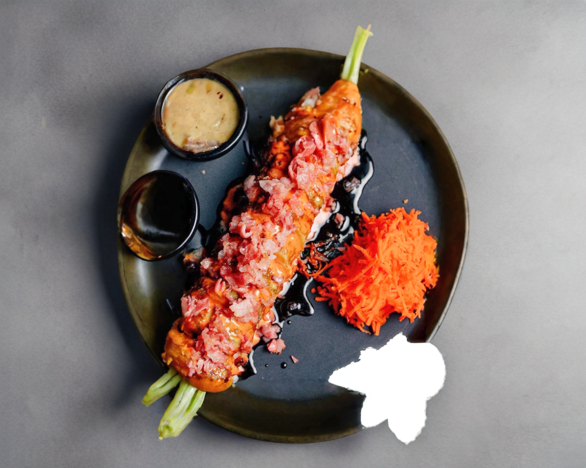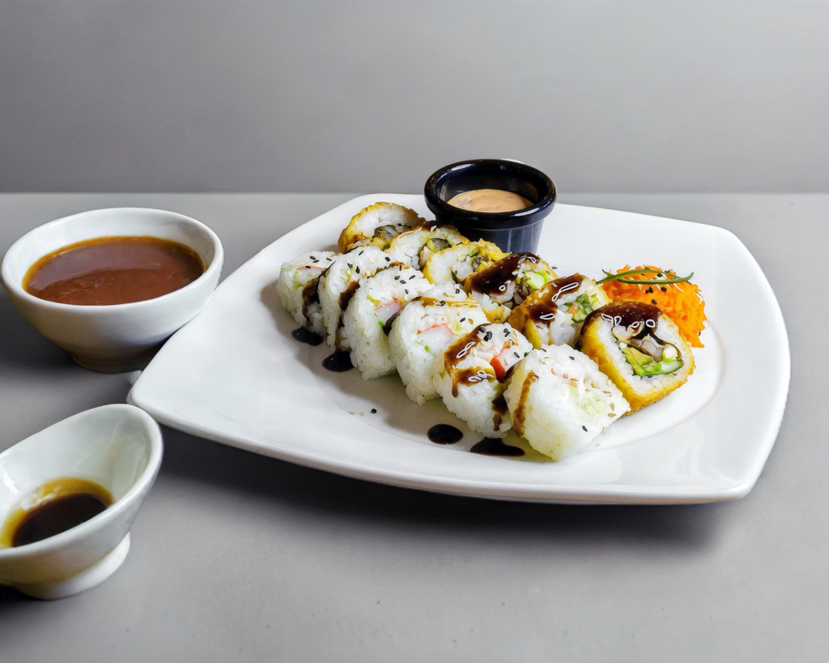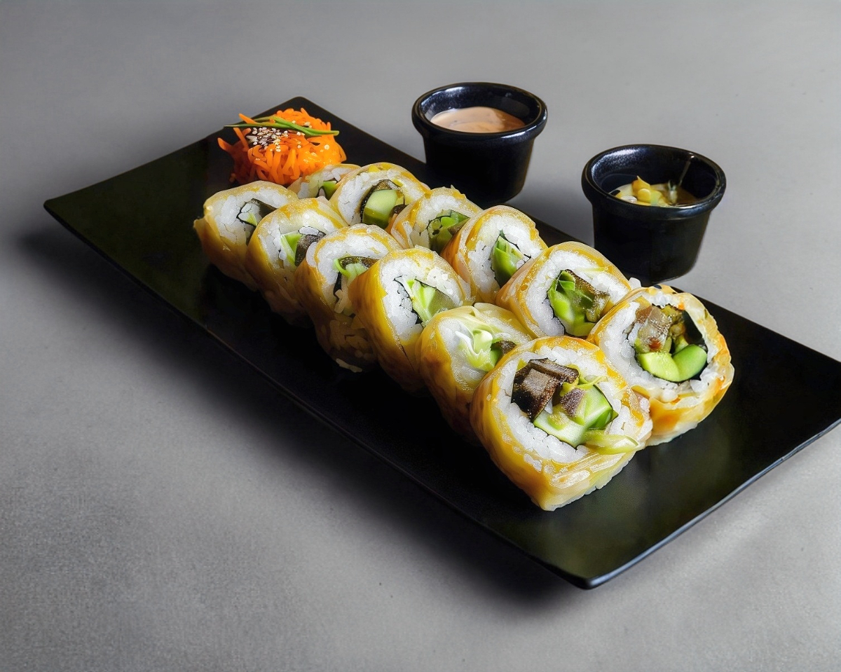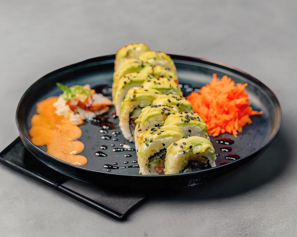Interior: queso crema, aguacate, pepino y zanahoria. Exterior: forrado con queso crema, aguacate y salsa especial.