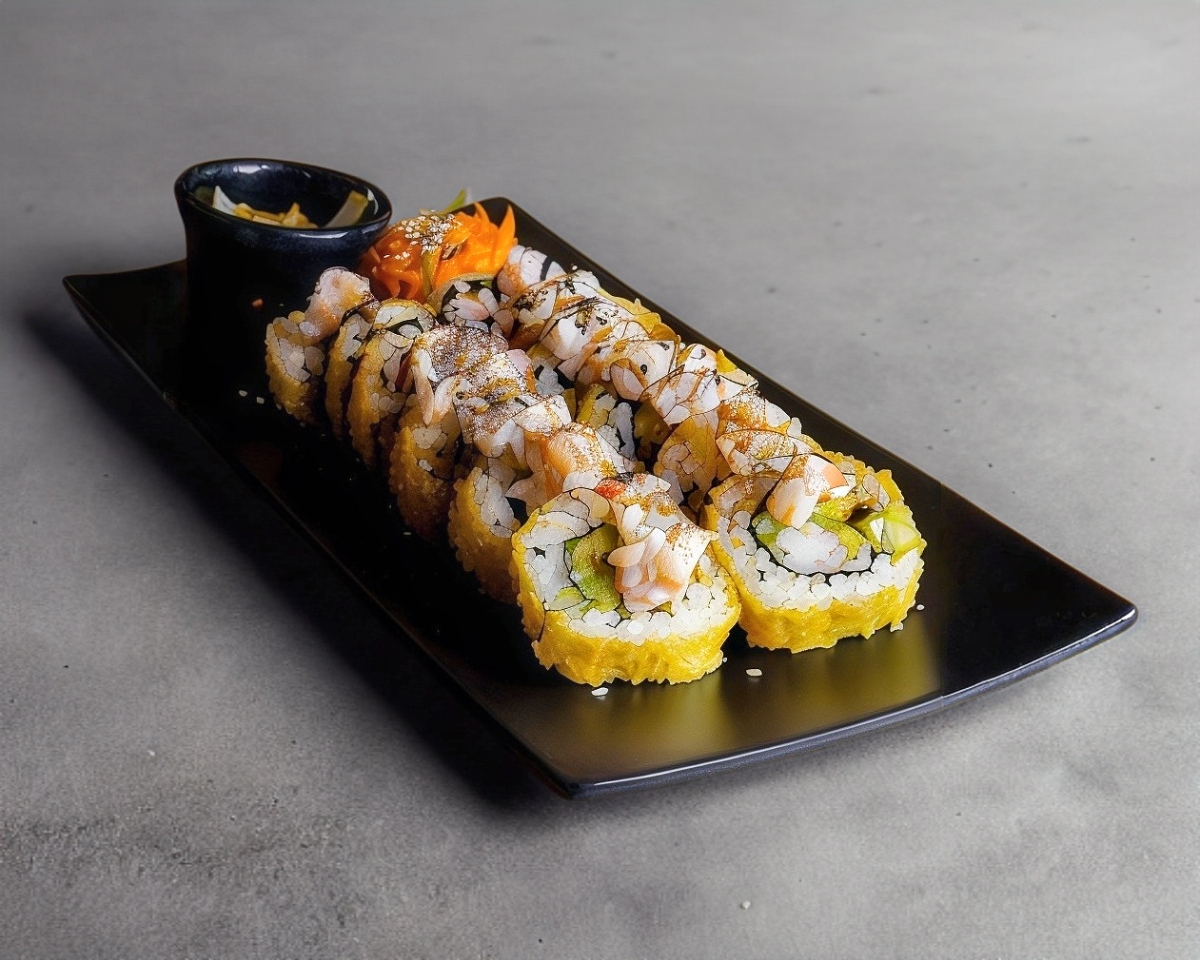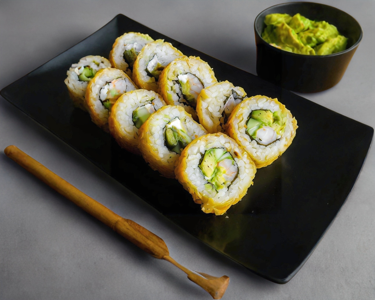 Interior: queso crema y camarón empanizado. Exterior: forrado con aguacate y camarón. Encima con tampico, salsa de anguila y ajonjolí.