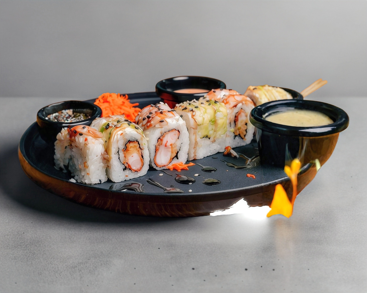 Interior: queso crema, aguacate, pollo, y camarón. Encima tocino. Bañado en 2 salsas de la casa y anguila.