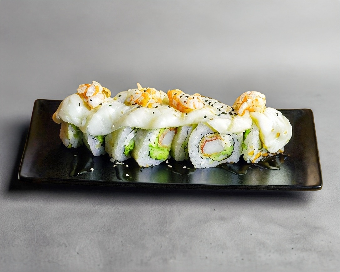 Philadelphia, aguacate, pepino y surimi. Encima queso gratinado cremoso, con trozos de camaron. Bañado en salsa de anguila.