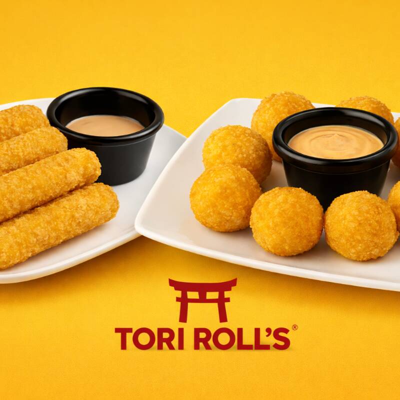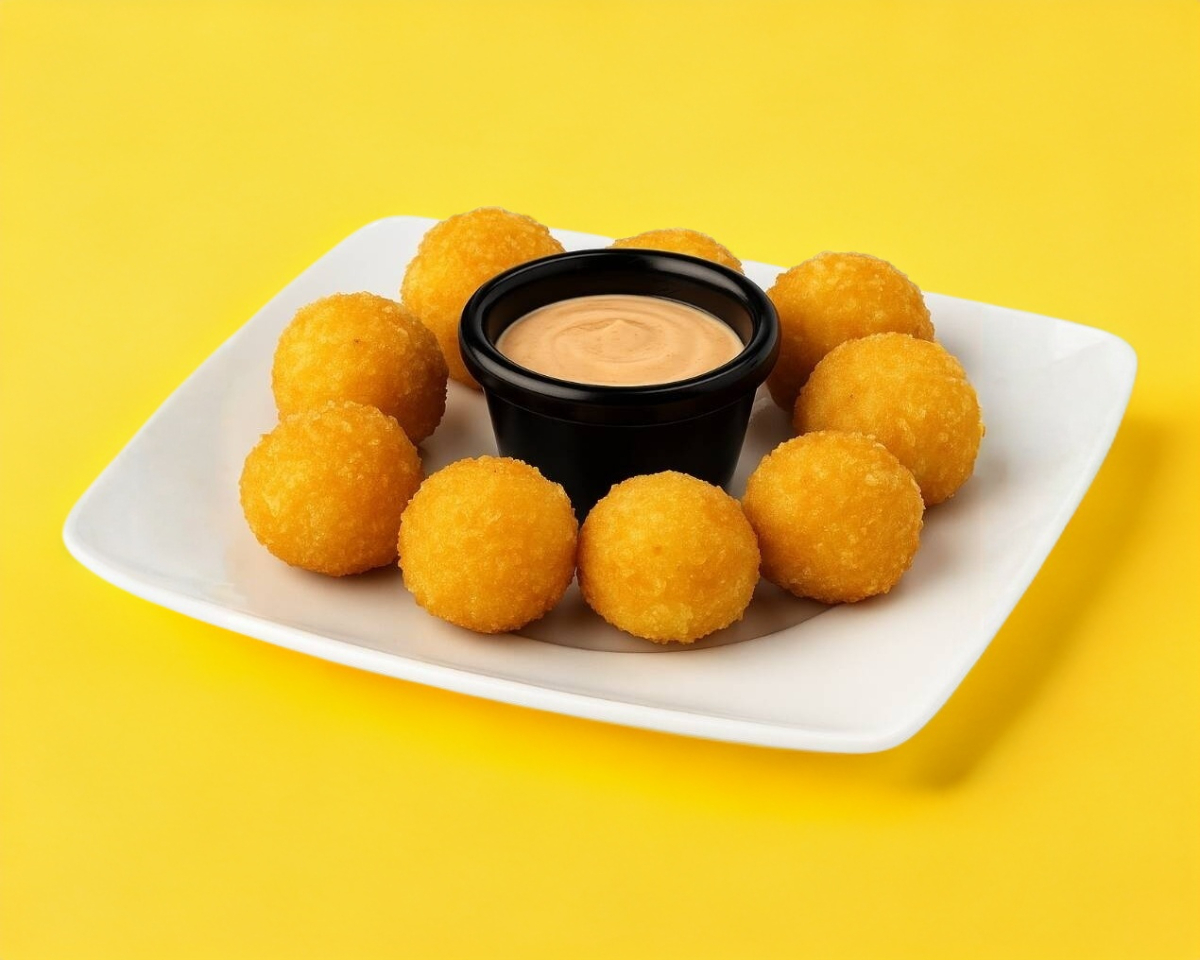 8 Bolitas de arroz rellenas de queso crema y camarón acompañadas de aderezo chipotle.