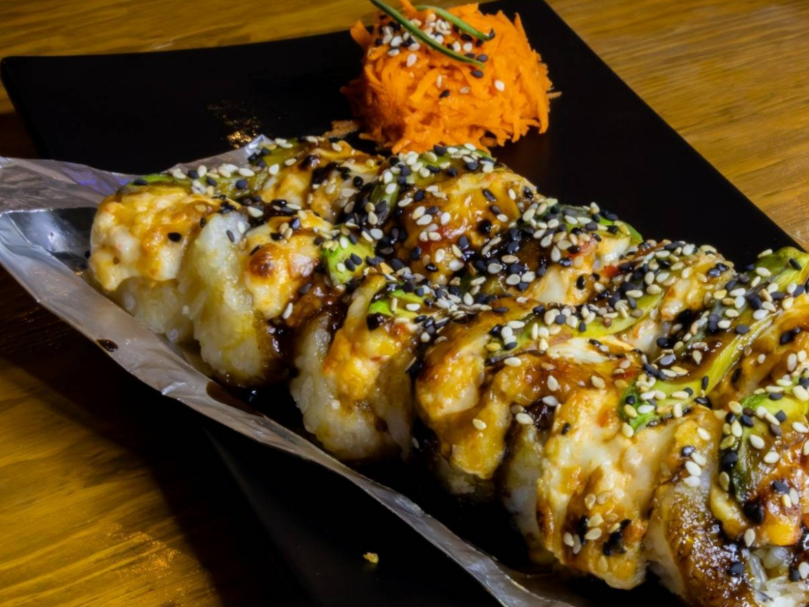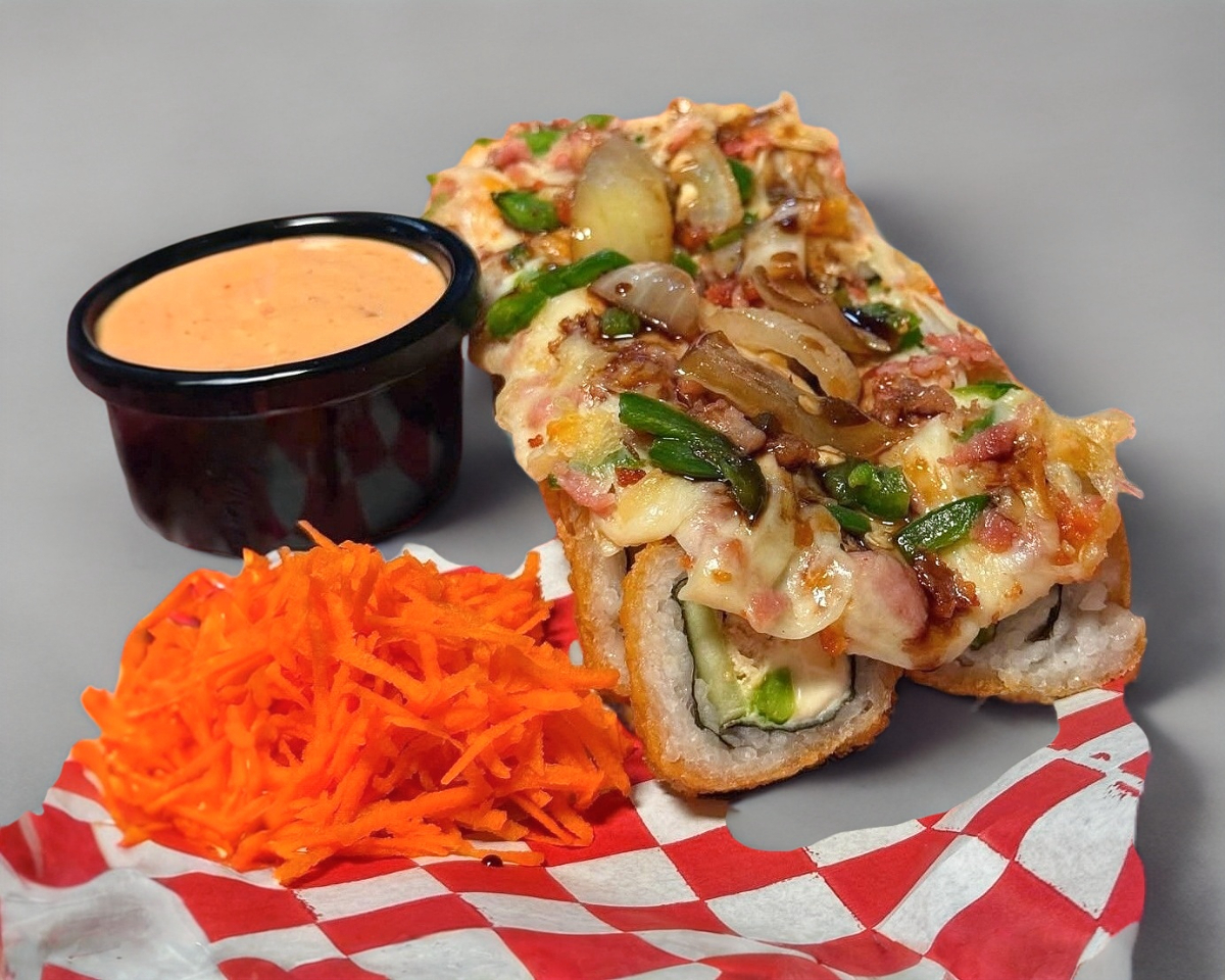 Philadelphia, pepino, aguacate, pollo, gratinado con queso, tocino, chile jalapeño, cebolla, bañado en salsa de anguila