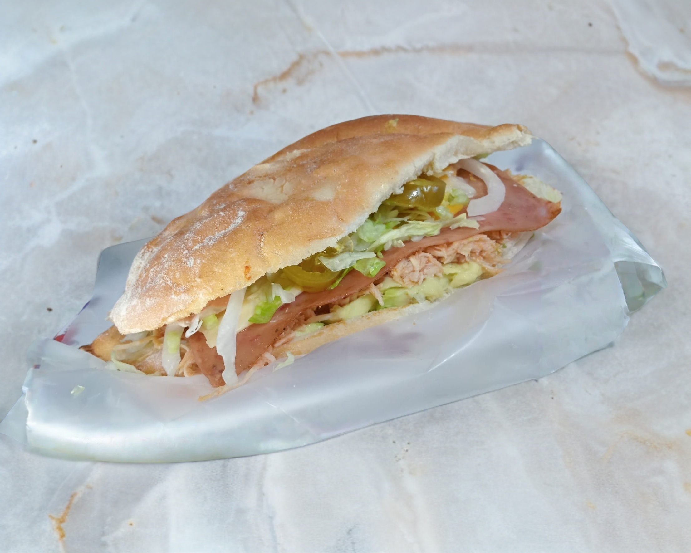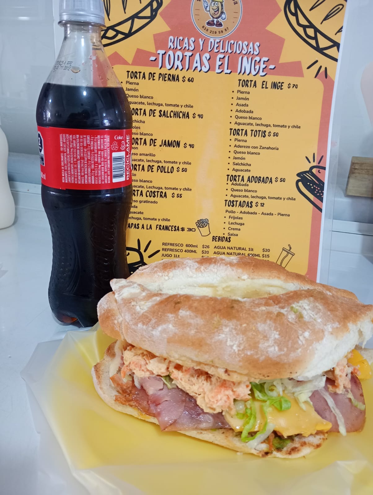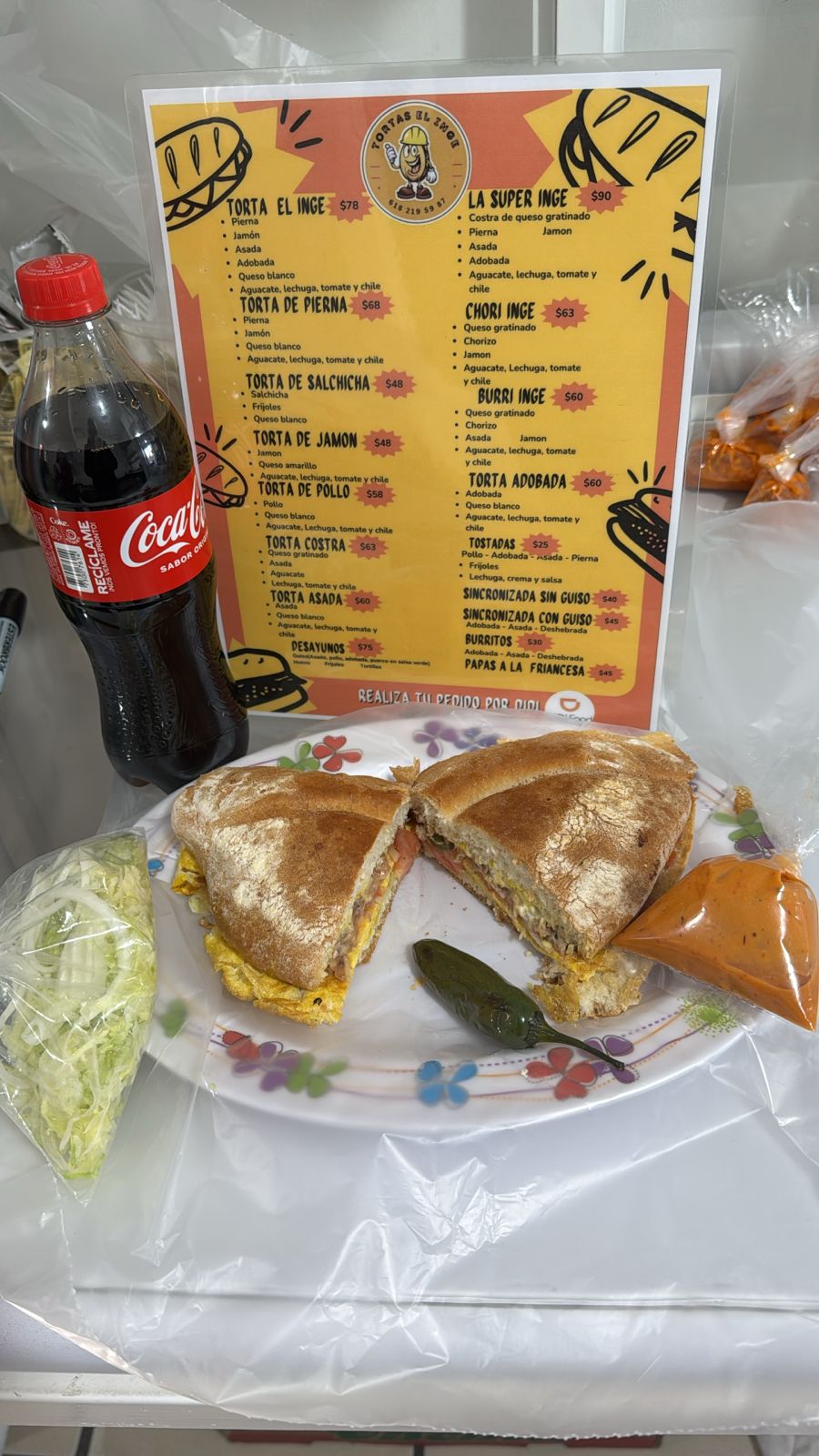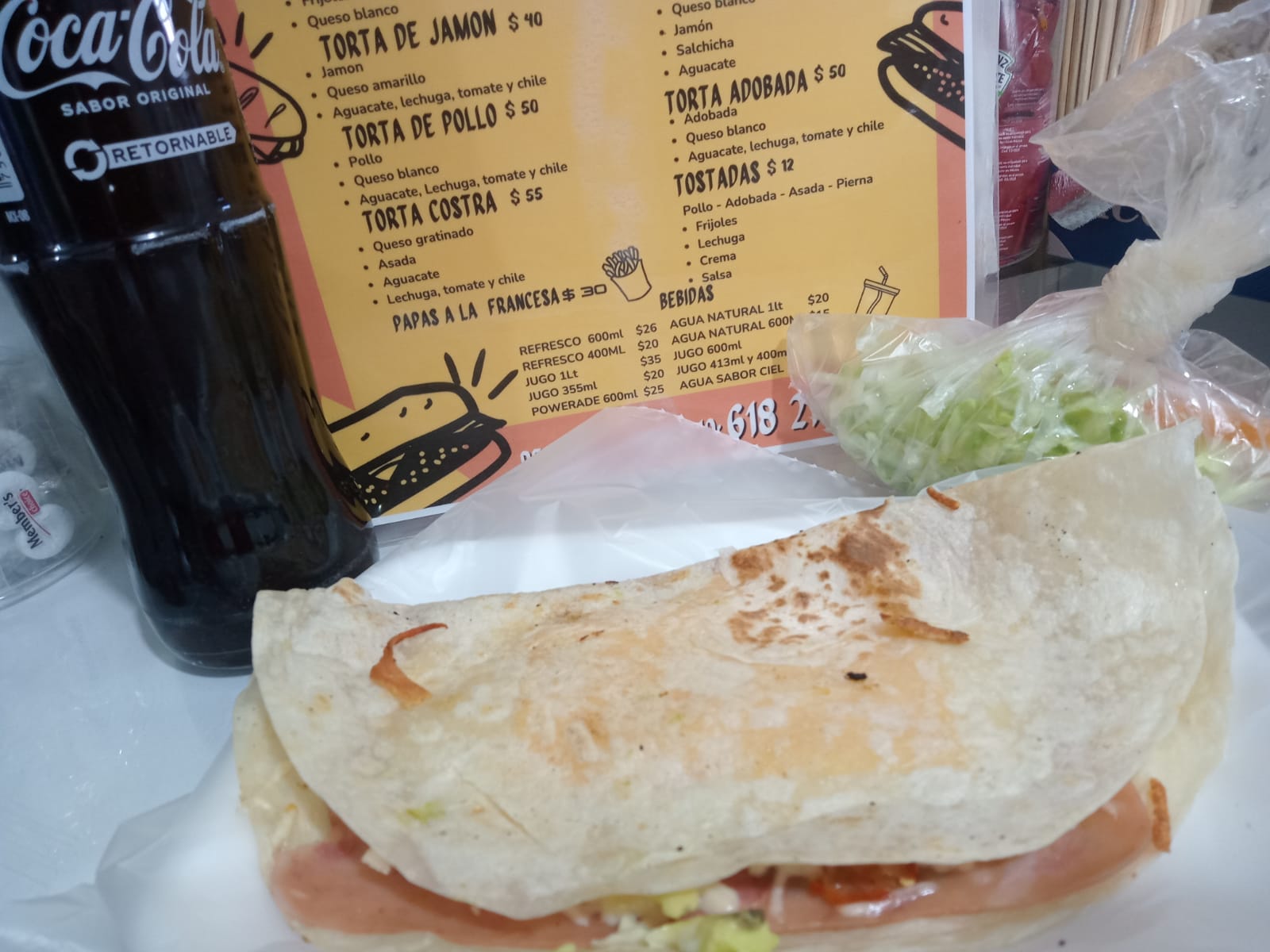 1 Torta de Pierna, jamón americano, queso blanco, aguacate, lechuga, tomate y chile. salsa a parte (Aderezo de Chipotle) Porción Personal.