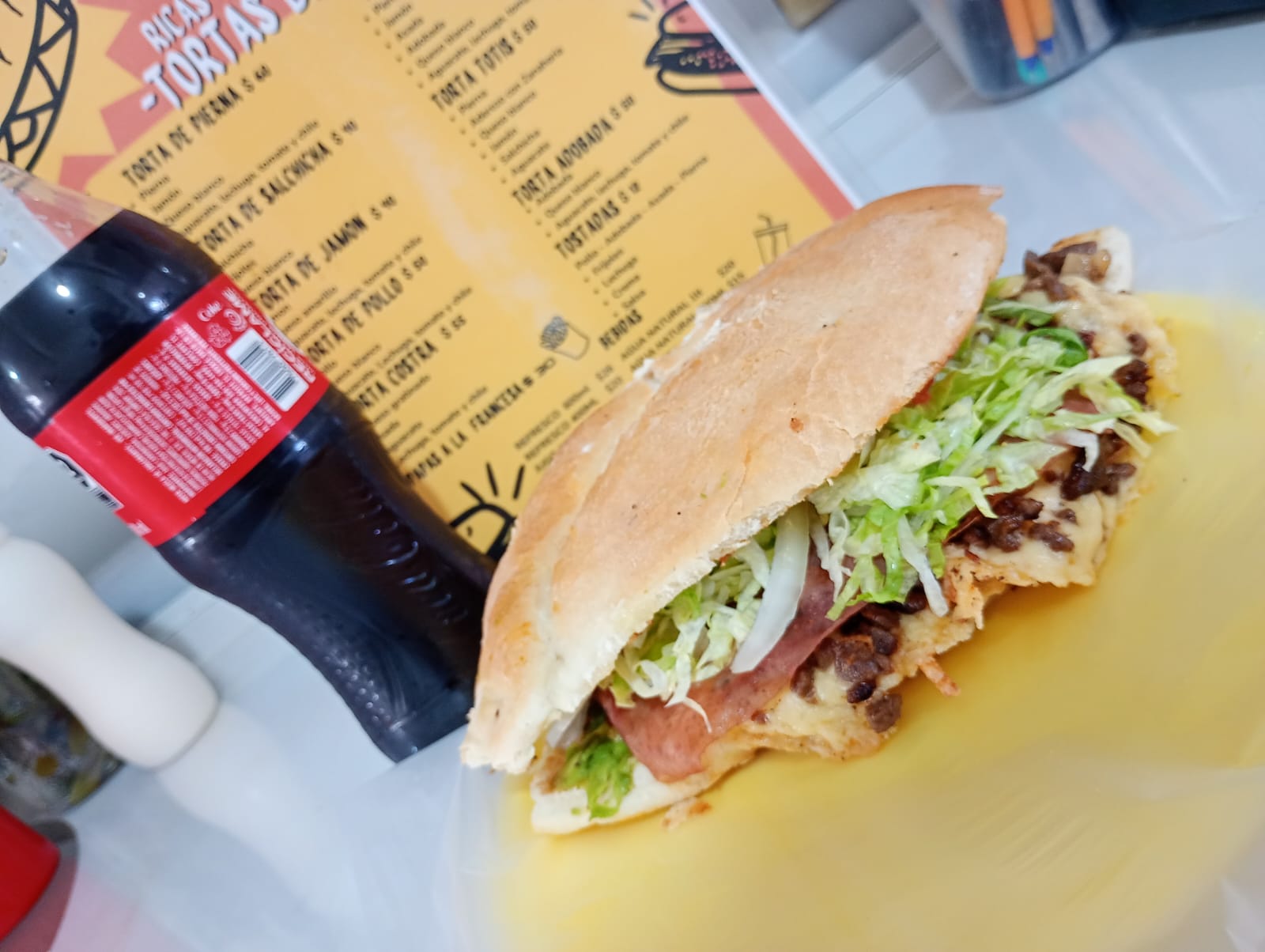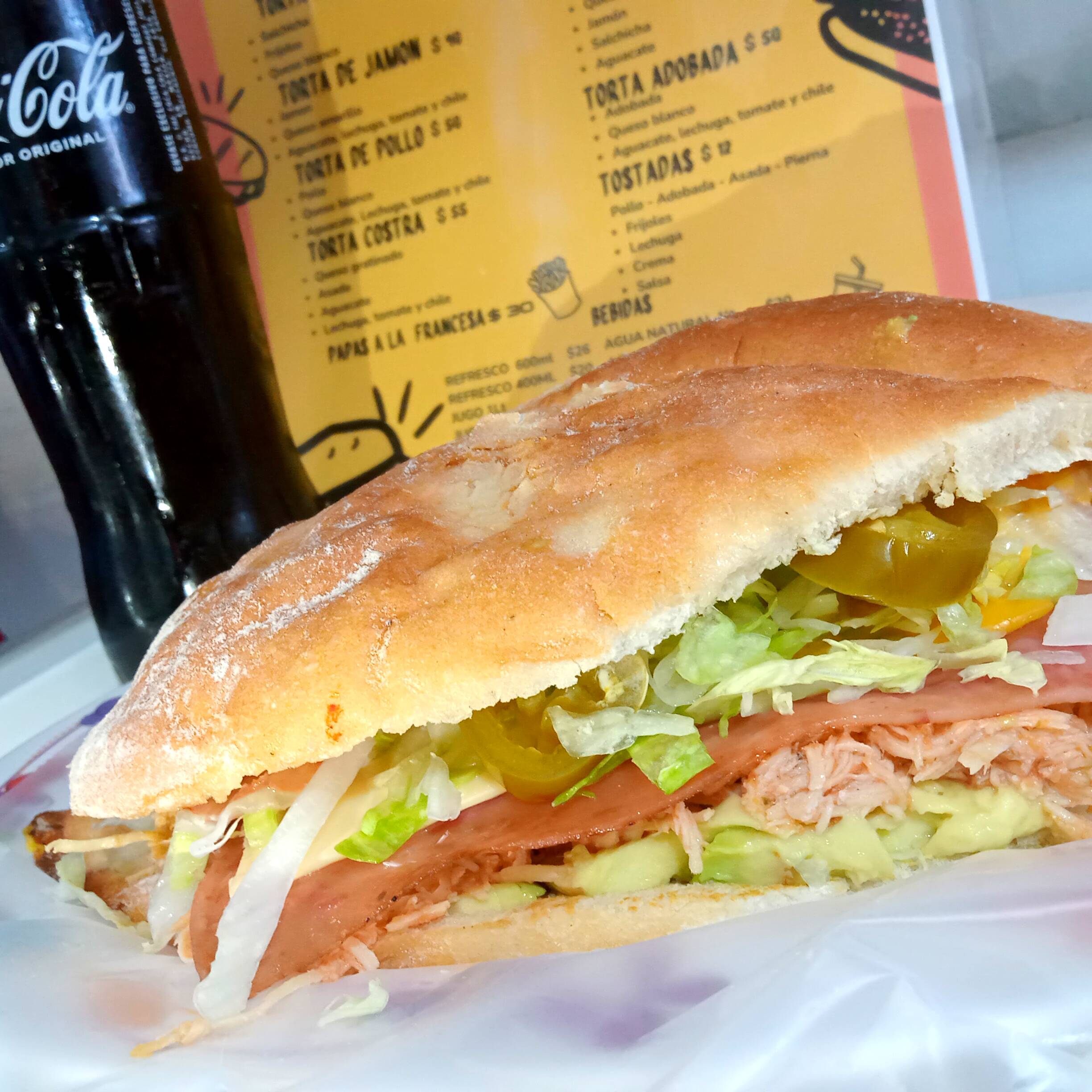 Pierna, jamón, asada, adobada, queso blanco, aguacate, lechuga, tomate y chile.