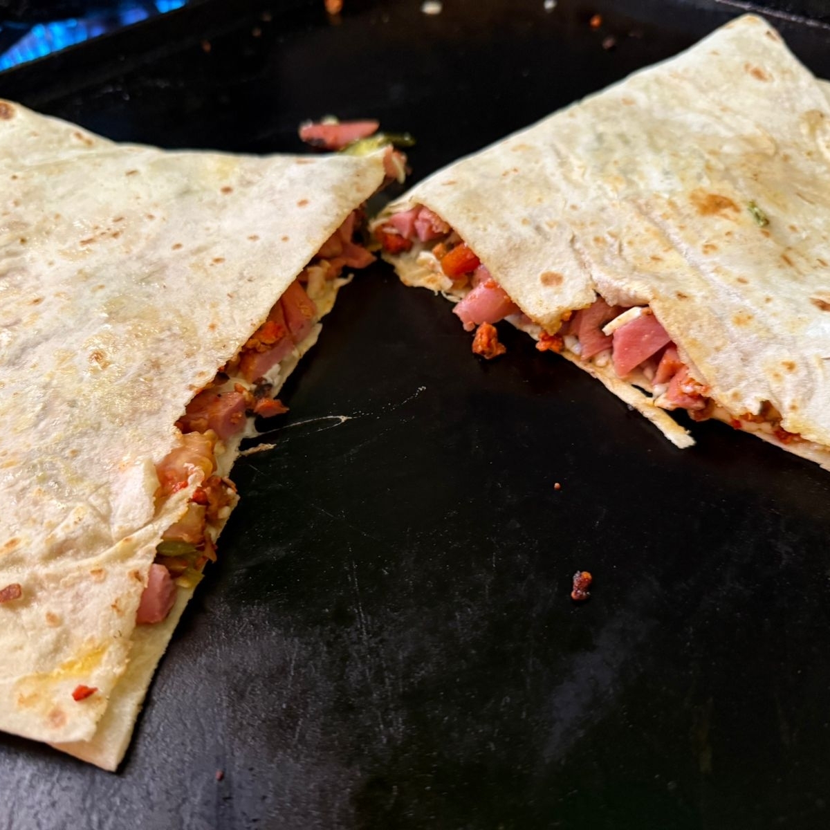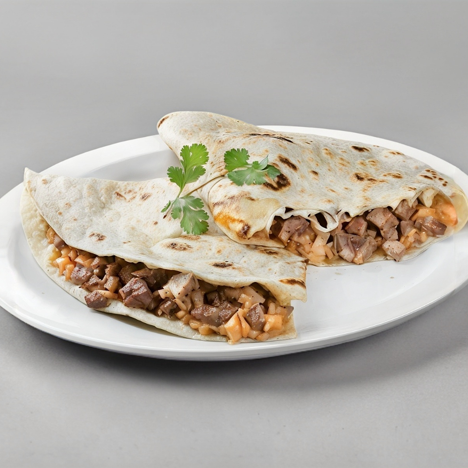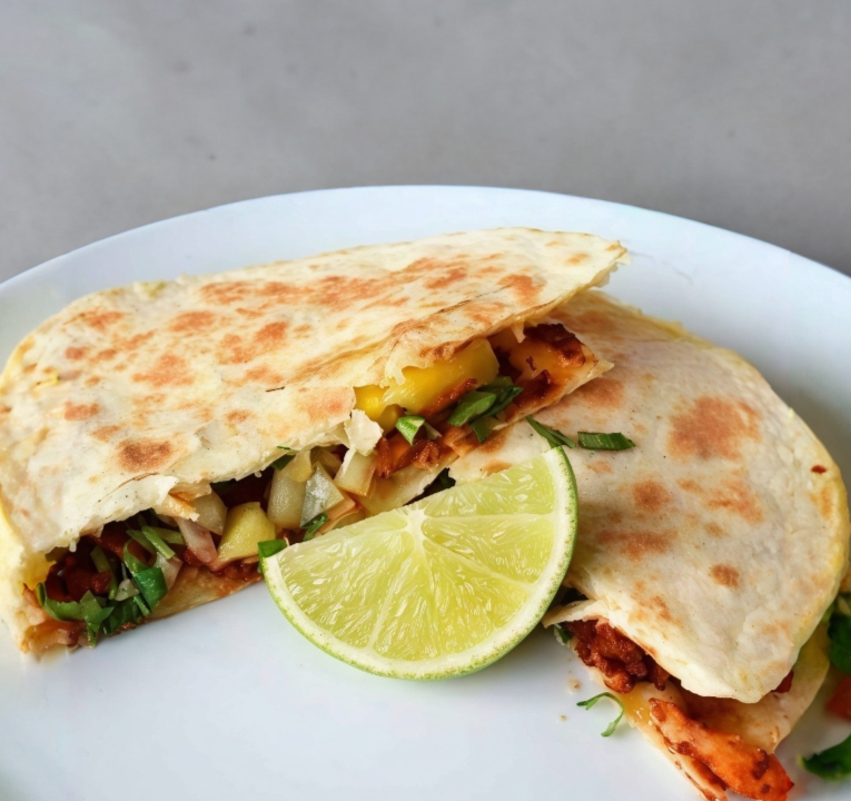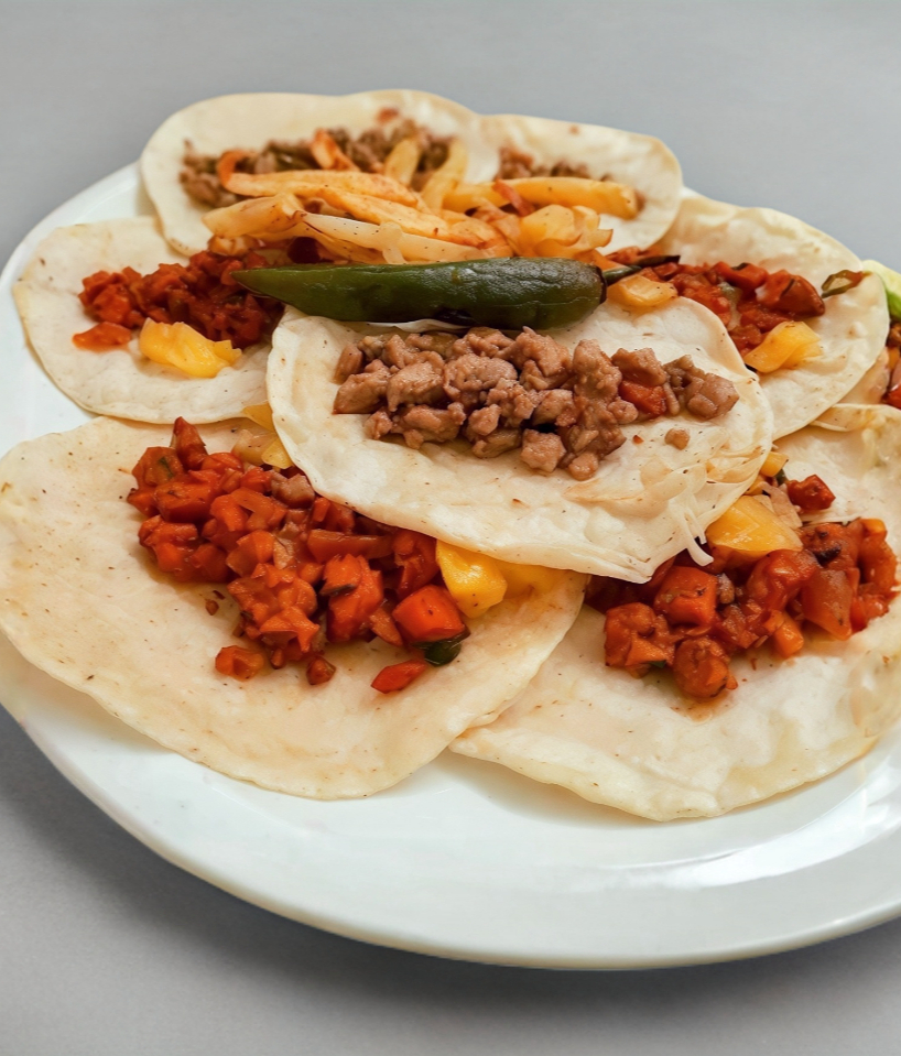 2tortillas de harina con Mayonesa, frijoles, queso blanco y carne al pastor acompañado de papas a la francesa verdura y salsa