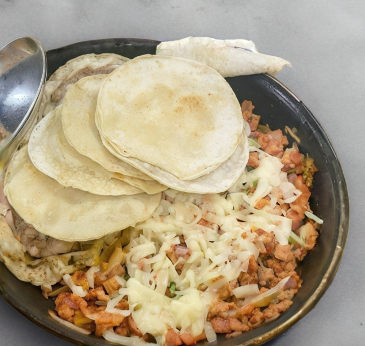 Carne asada con tocino, cebolla, chile morron, queso 6 tortillas de maiz acompañada de papas a la francesa, verdura y salsa
