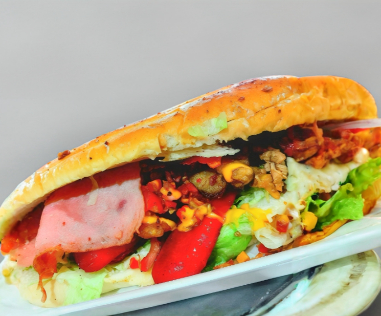 Pan Gigante con mayonesa, lechuga, tomate,chile, aguacate, salchicha, jamon, queso, pierna, milanesa, jamon y queso acompañada de una porcion de papas.