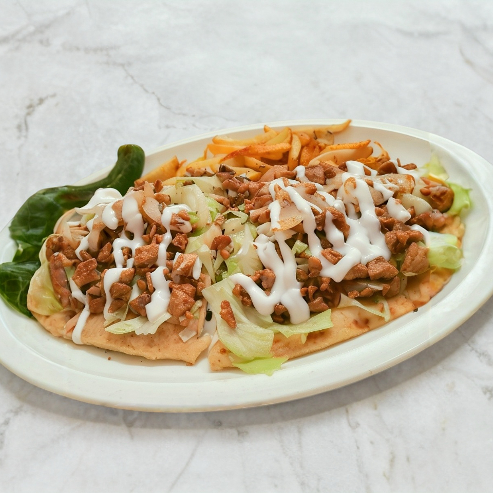 Tortilla de harina gigante con mayonesa, frijoles, queso blanco y carne a tu eleccion acompañado de papas a la francesa verdura y salsa