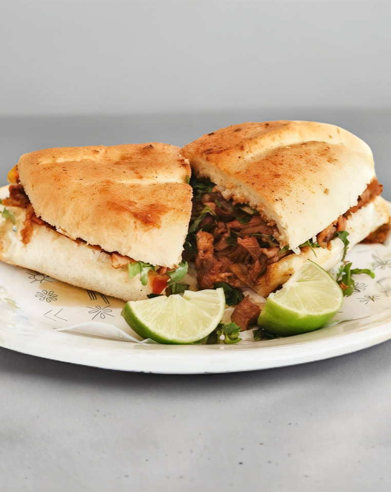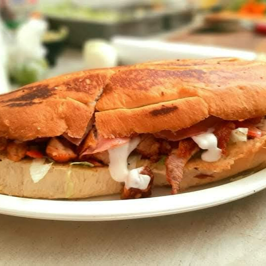 Pan gigante con mayonesa, lechuga, tomate, chiles, aguacate, carne a tu eleccion, jamon y queso acompañadas de una porcion de papas a la francesa