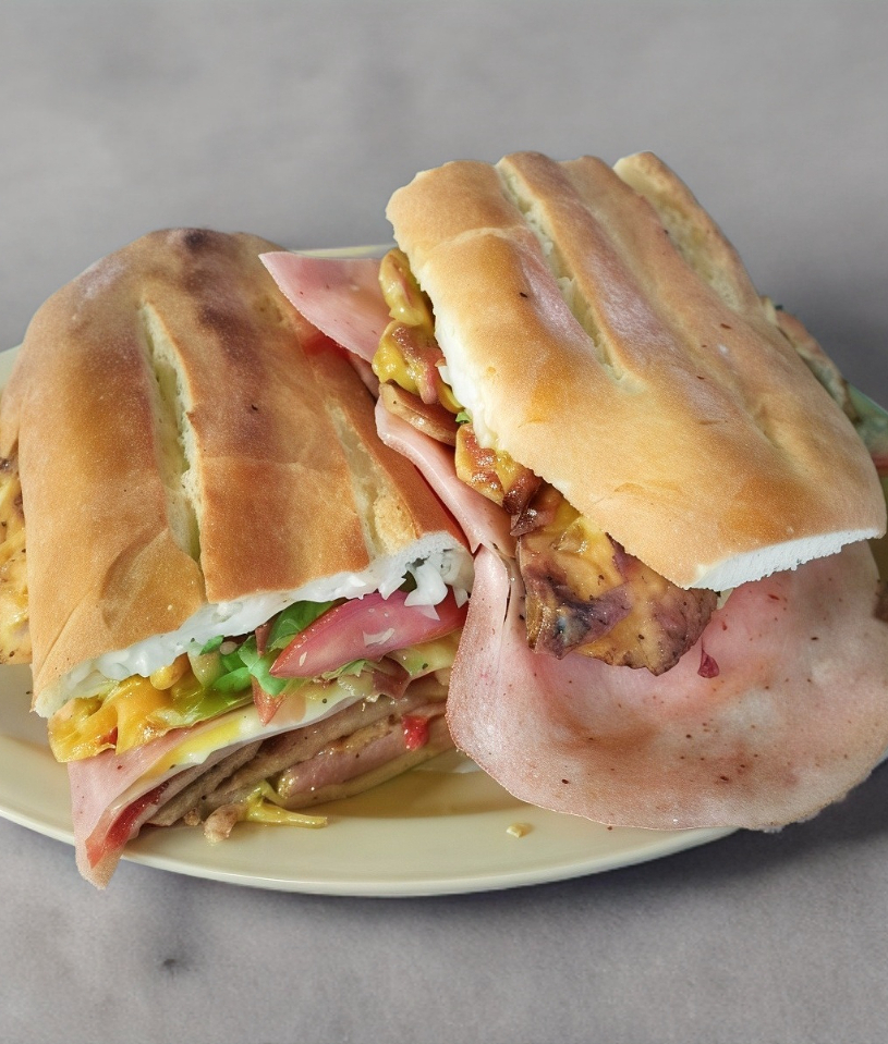 Pan gigante con mayonesa, lechuga, tomate, chiles, aguacate, 6 rebanadas de jamon carne al pastor, piña y quesa blanco acompañadas de una porcion de papas a la francesa.