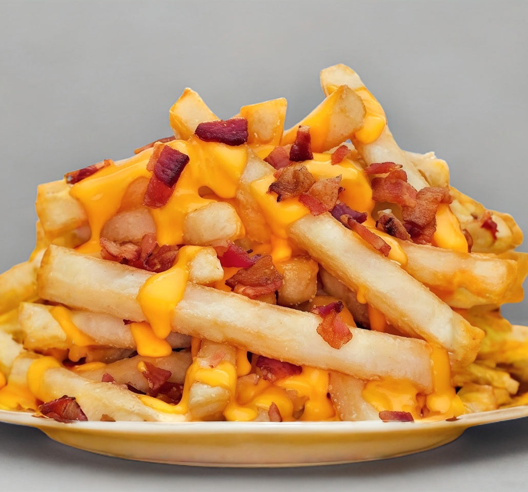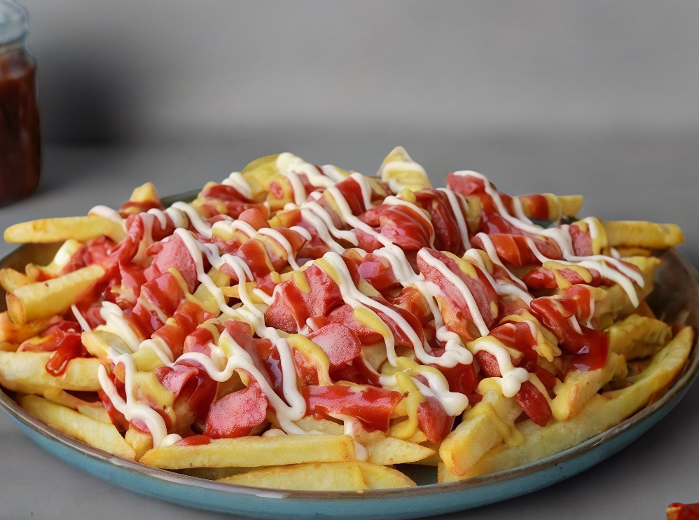 Trocitos de salchicha con papas a la francesa, mayonesa, catsup, chiles, queso amarillo.