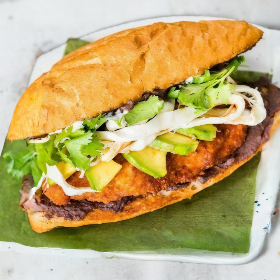 Pan Gigante con Mayonesa, lechuga, tomate, chiles, aguacate, fajitas de pollo empanizado con pierna, jamon y queso acompañada de una porcion de papas a la francesa.
