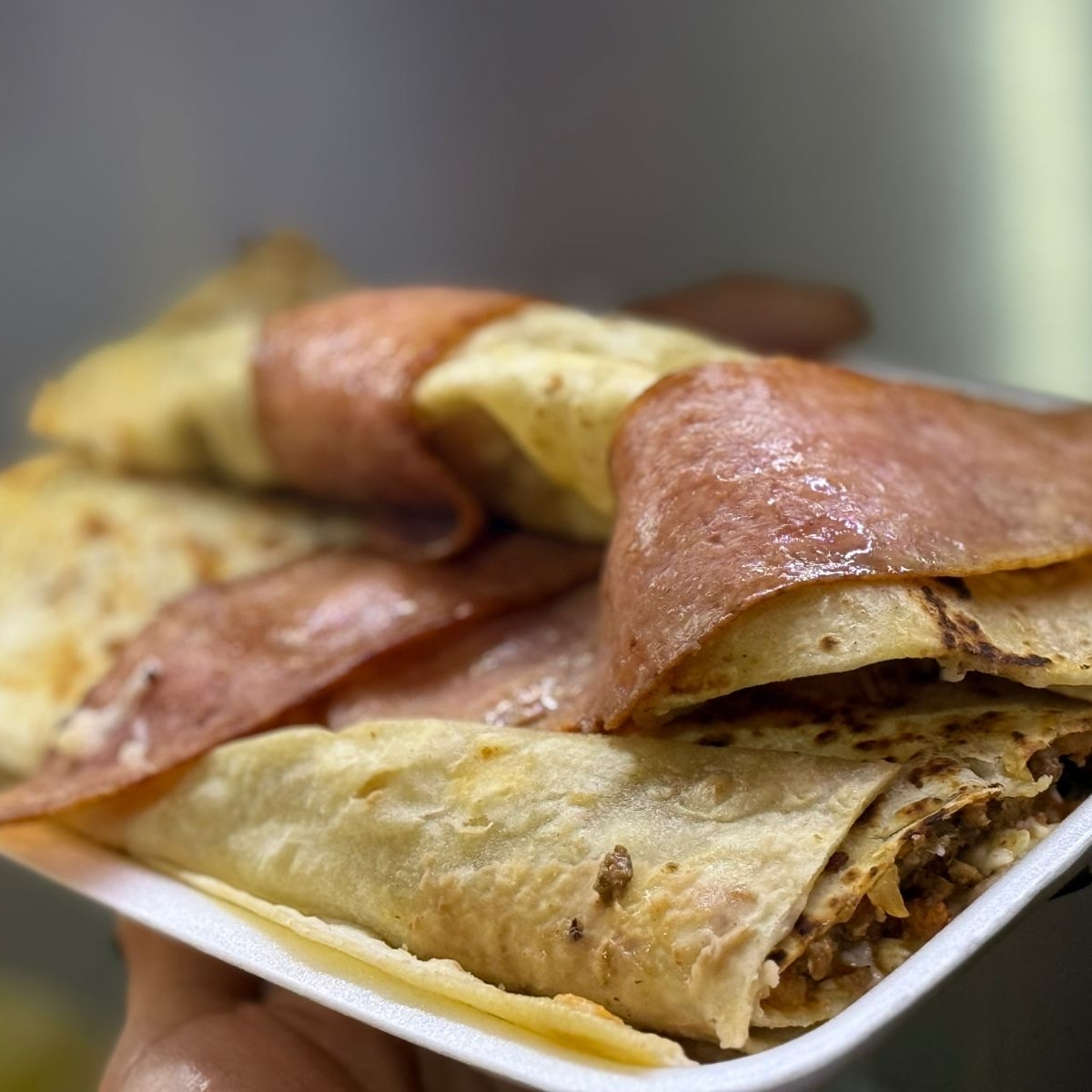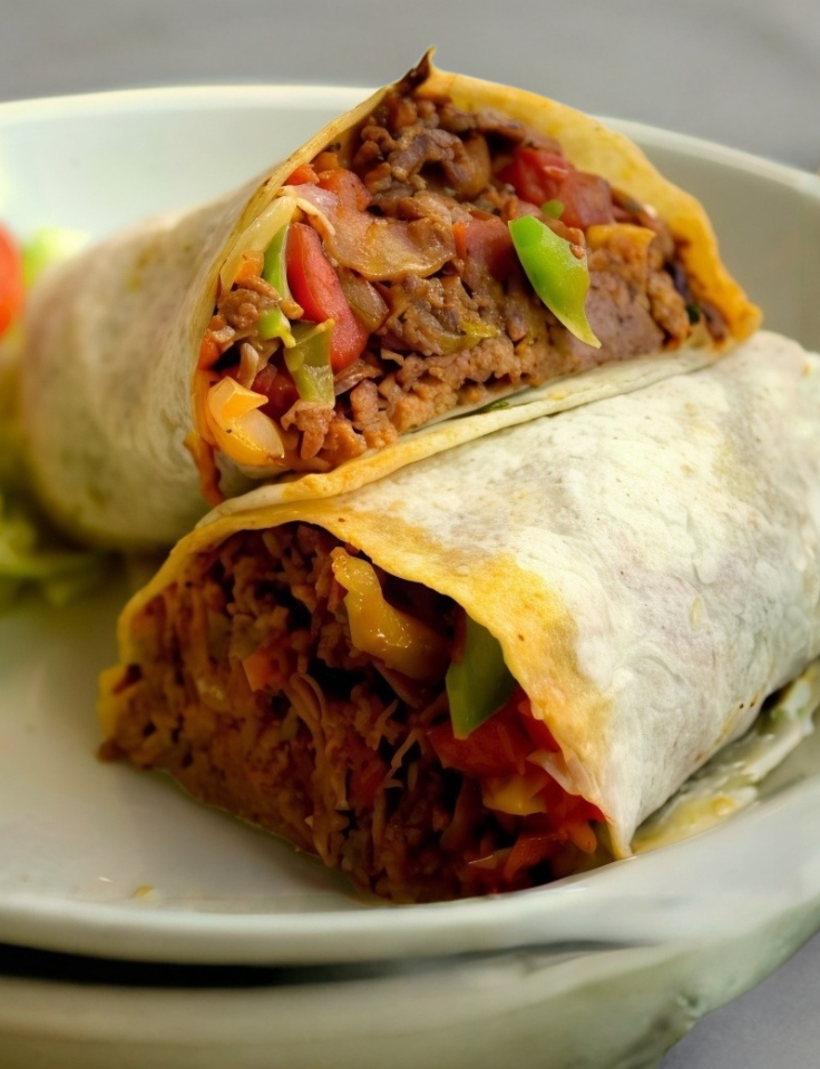 Tortilla de burro gigante, mayonesa, frijoles, carne a tu eleccion, queso blanco, salchicha roja, envuelto con tocino, y papas a la francesa.
