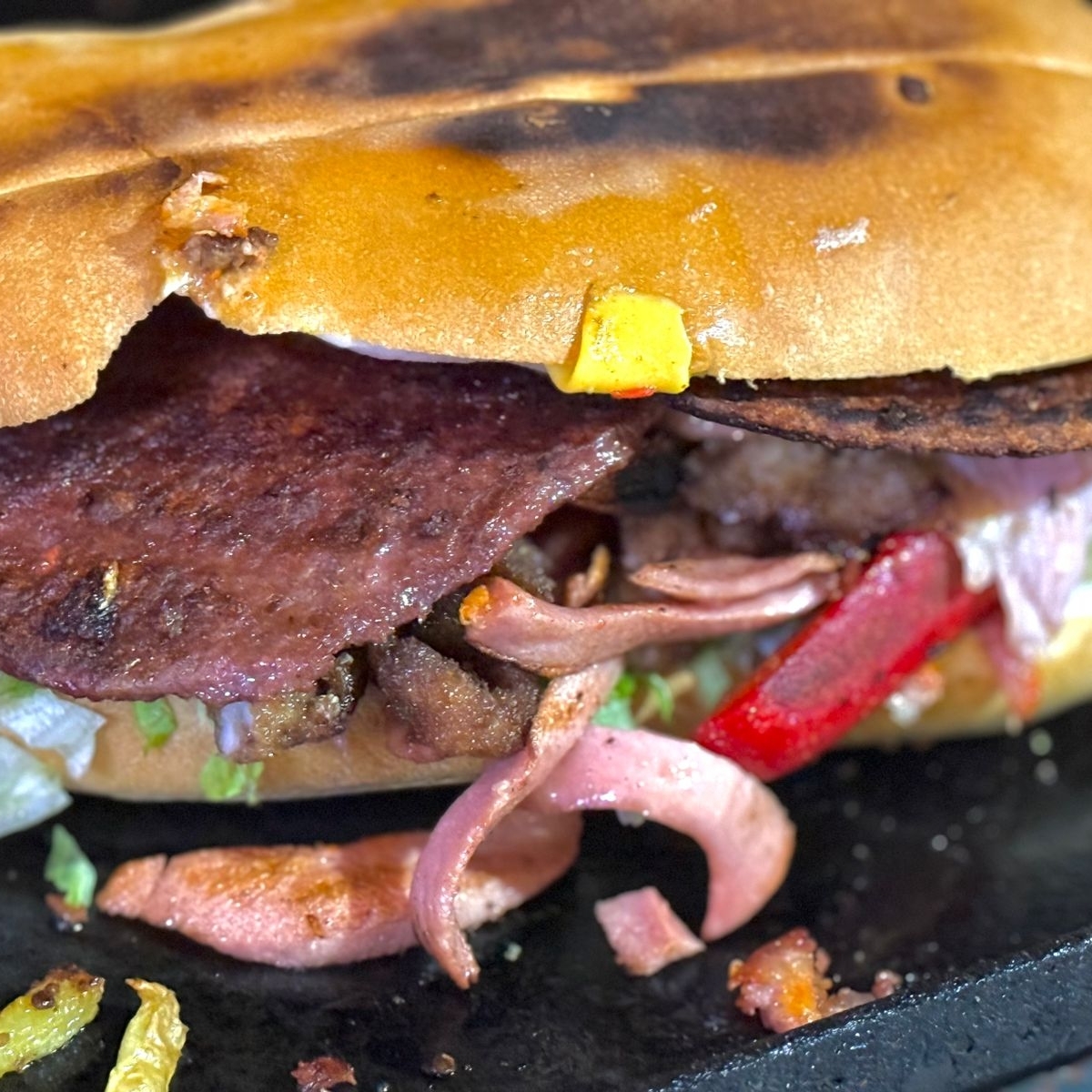 Pan gigante de hamburguesa, mayonesa, lechuga, tomate, chile, catsup, piña salchicha, 2 rebanadas de jamon, queso 3 carnes de hamburguesa, acompañadas de papas a la francesa.