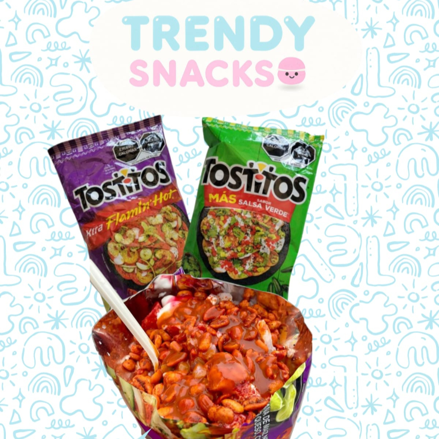 Tostitos verdes o morados, elote, queso amarillo, queso blanco, salsas