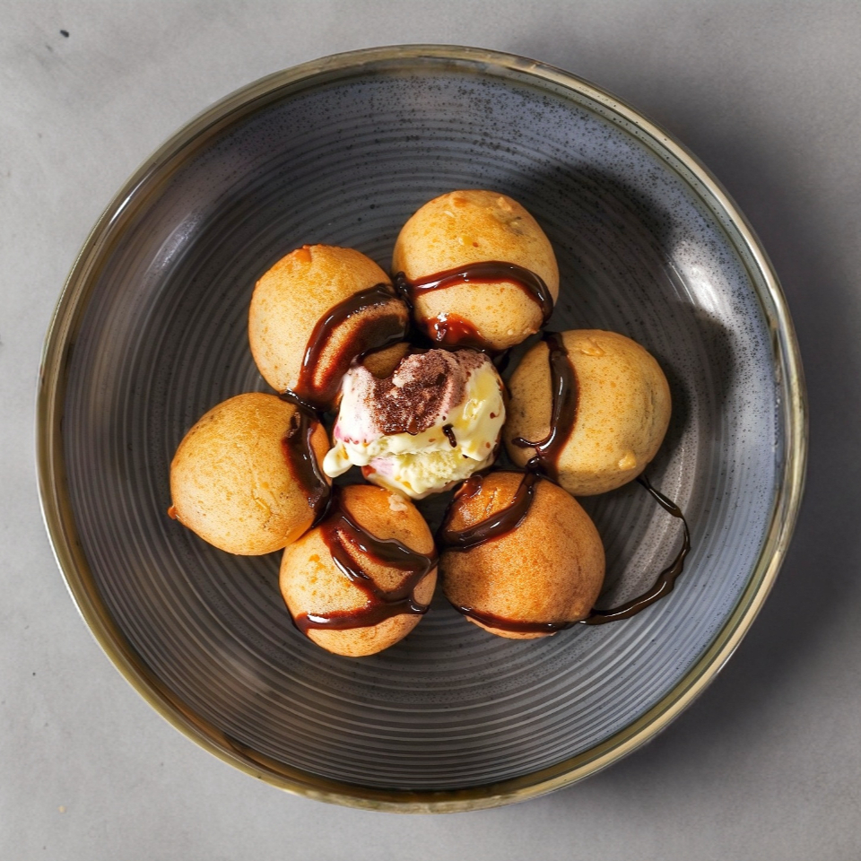 Orden de 6 galletas oreos fritas, acompañadas de una bola de nieve y chocolate.