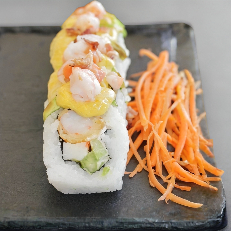 Maki natural relleno de queso crema, aguacate, pepino, camaron empanizado y surimi, aguacate por fuera y bañado en nuestro topping de mostaza. Incluye salsa de soya, aderezo chipotle y serranitos con soya)