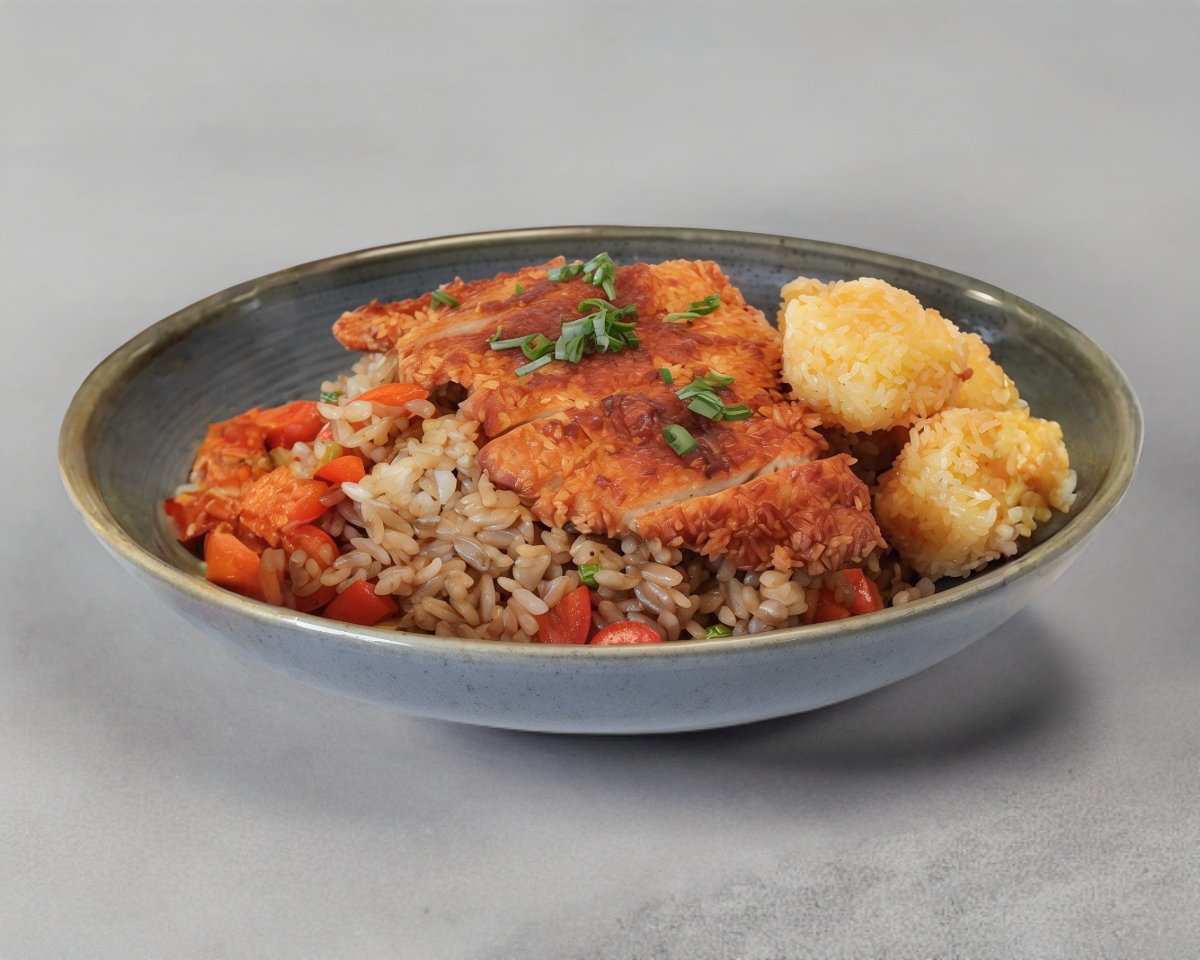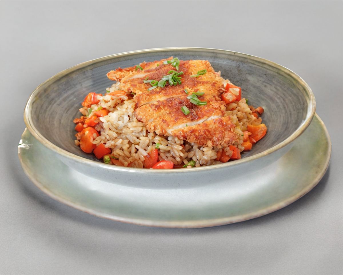 Arroz frito con calabaza, zanahoria, cebolla, apio y chile morrón, acompañado con una chuleta de cerdo frita con una salsa oriental.(Acompañado de salsa de soya y chipotle).