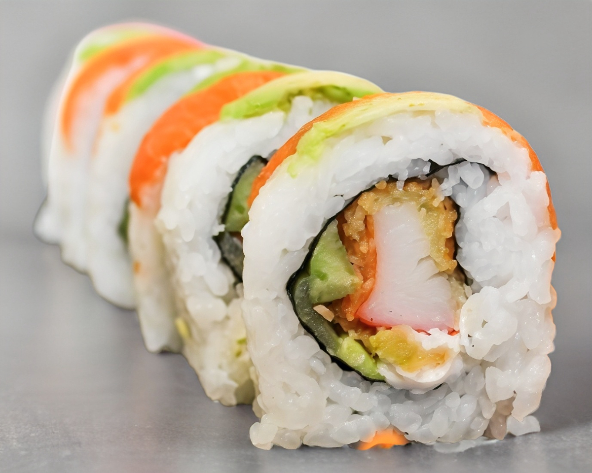 Maki natural relleno de queso crema, aguacate, pepino y surimi empanizado, con salmón y aguacate por encima. Incluye salsa de soya, aderezo chipotle y serranitos con soya.