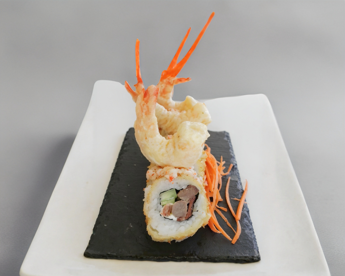 Maki empanizado relleno de queso crema, aguacate, pepino, arrachera y tocino, con tampico y camarones al tempura por fuera. incluye salsa de soya, aderezo chipotle y serranitos con soya.