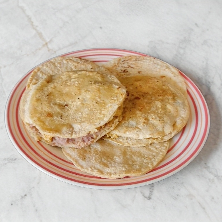 2 piezas, base de frijoles, guiso a elegir y queso.