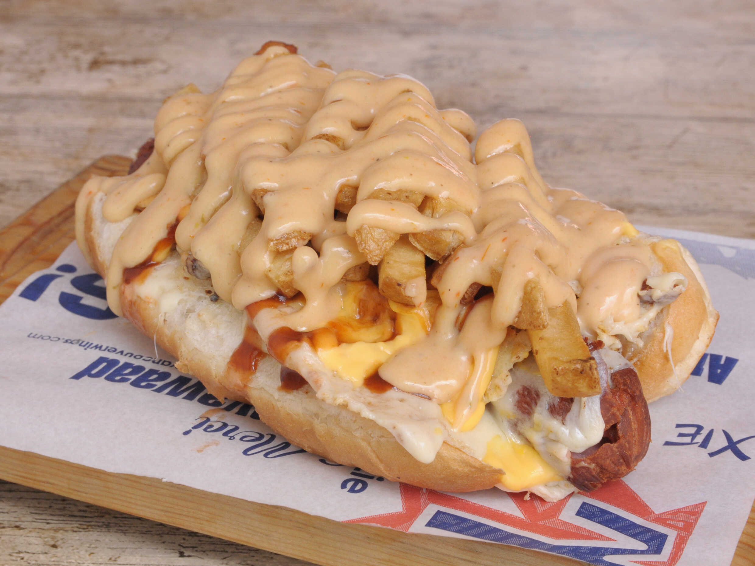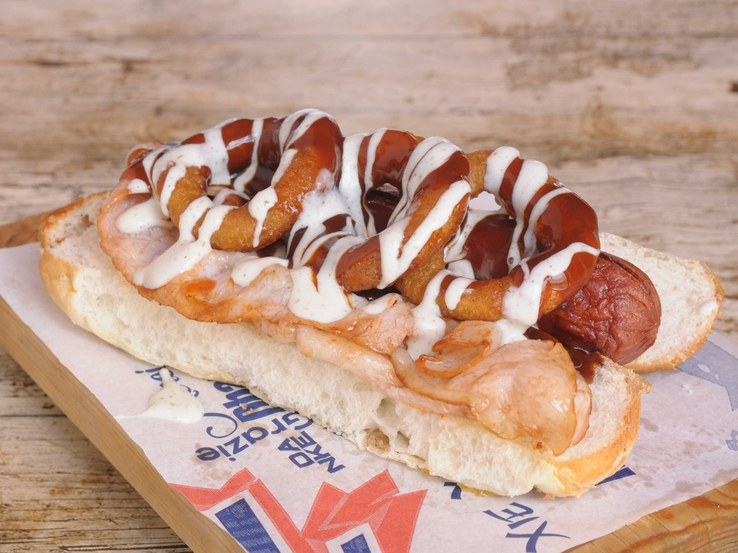 Hot dog con salchicha de res 65 g con tocino, 2 aros de cebolla, salsa especial y aderezo ranch.