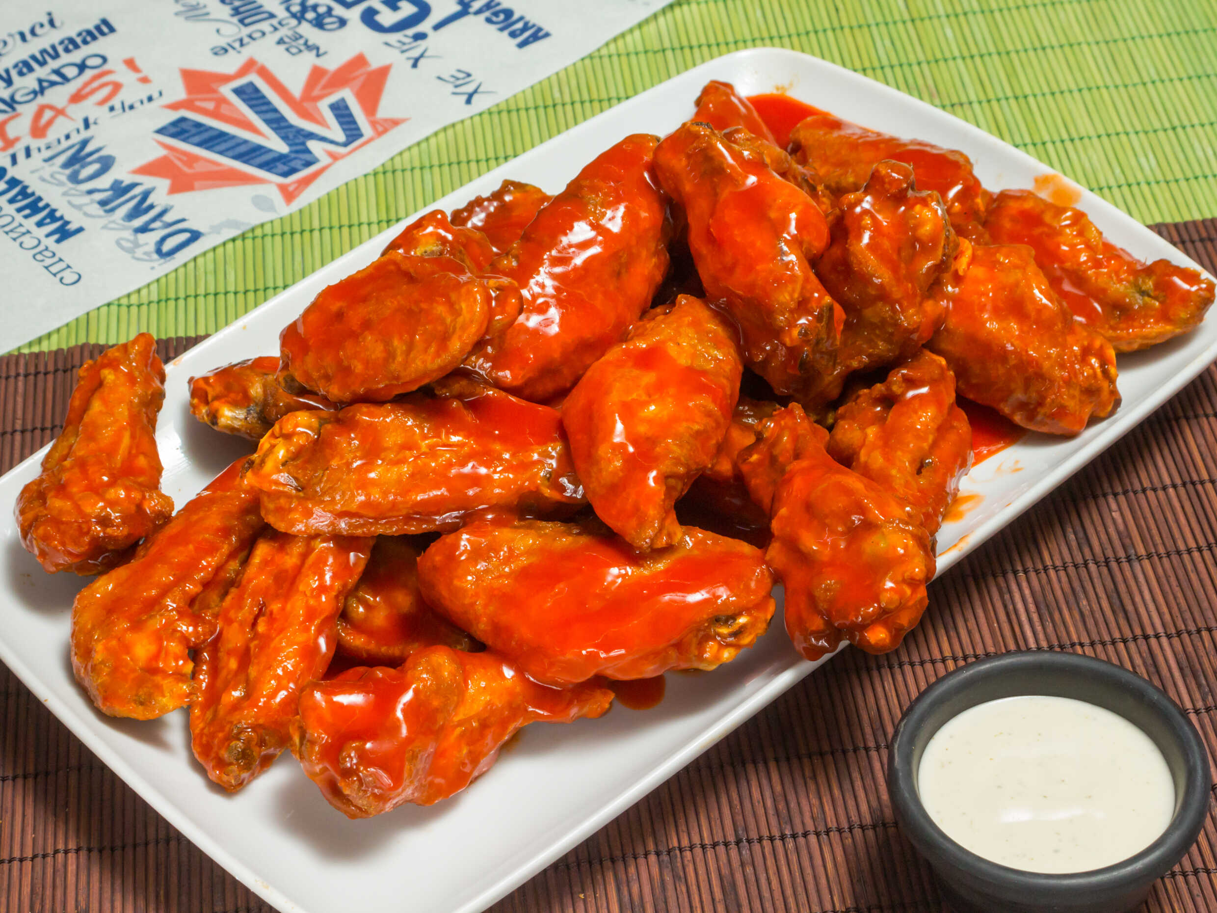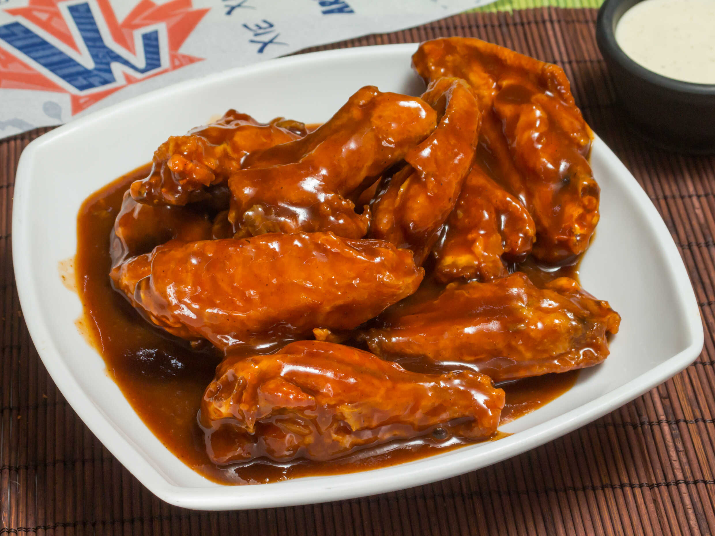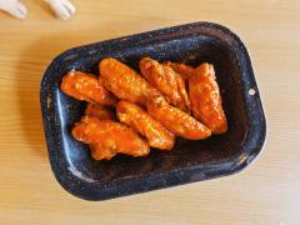 2 Ordenes de alitas bañadas con la misma salsa. El peso de las alitas se calcula en crudo.