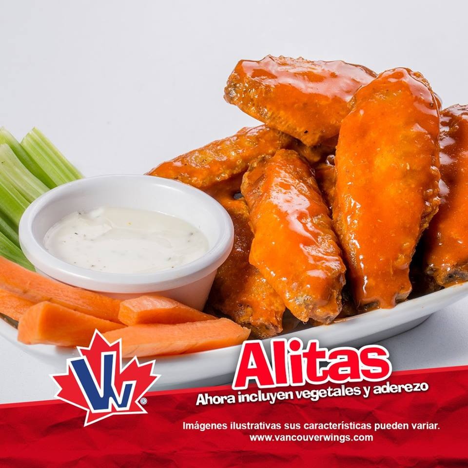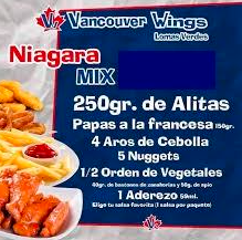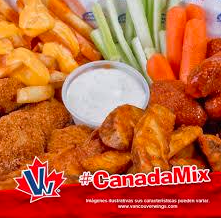 5 boneless (125 g aprox) con la salsa de tu elección, orden de 150g de papas gajo, 5 nuggets, orden de 150g de papas Vancouver, 1/2 orden de vegetales (50g de apio y 40g de zanahoria) y un aderezo a elegir de 59 ml.