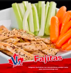 Fajitas de pollo 200g, aderezadas con salsa ajo, acompañadas con vegetales frescos 50g de apio y 40g de zanahoria.