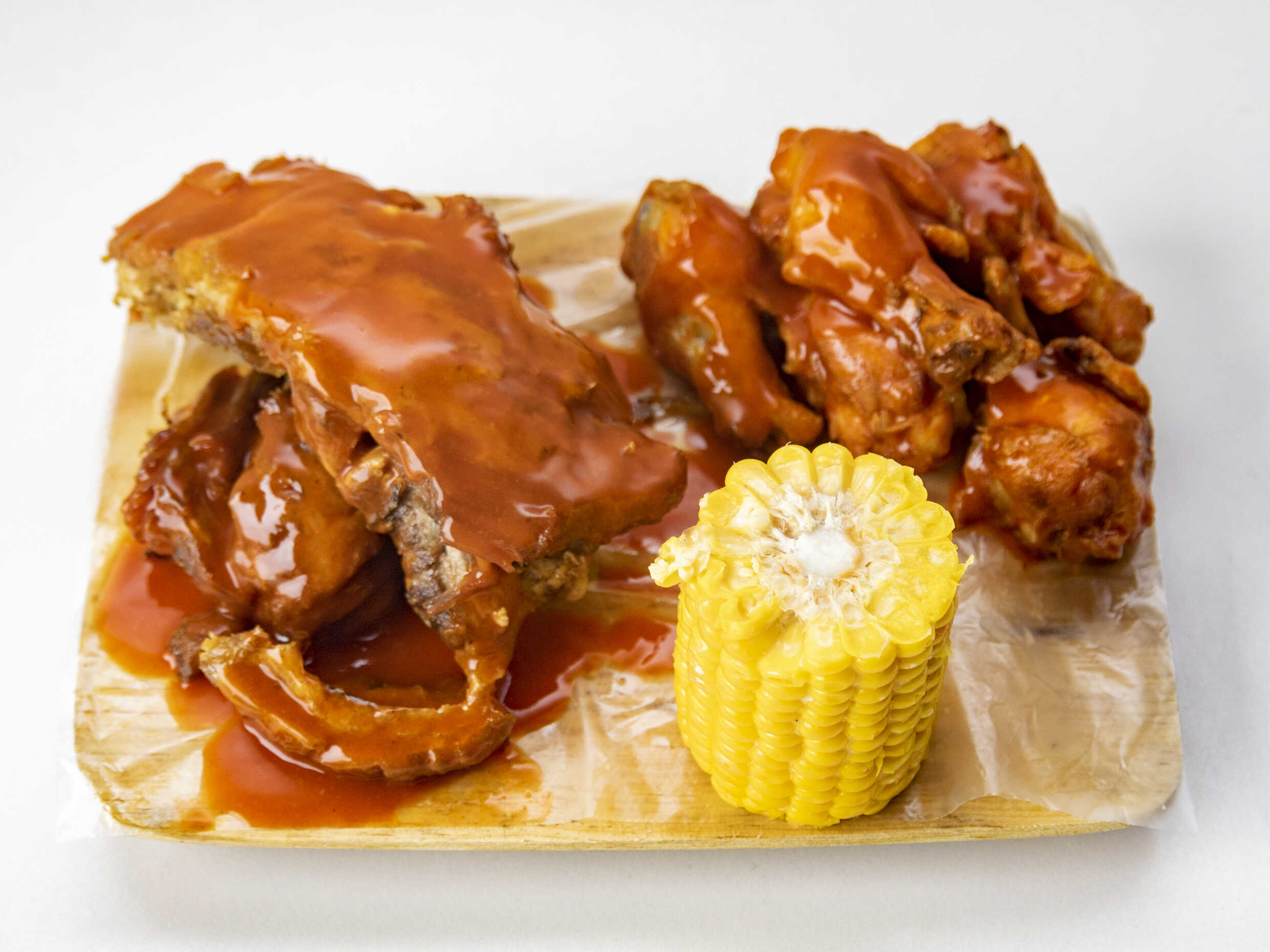 400 g de costilla y 250 g de alitas acompañadas por medio elote amarillo.
